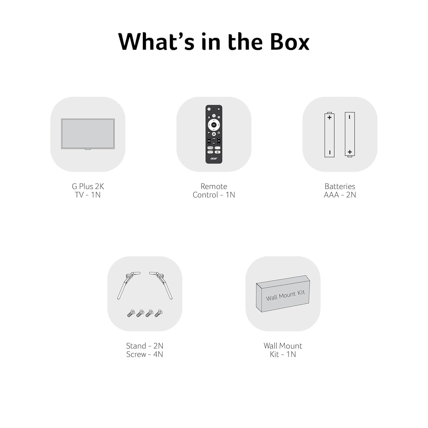 Mounting Hardware 1 LED TV, 2 Table Stands, 1 Wall Mount Kit, 1 User Manual, 1 Warranty Card, 1 Remote Control, 4 Screws, 2 AAA Battery