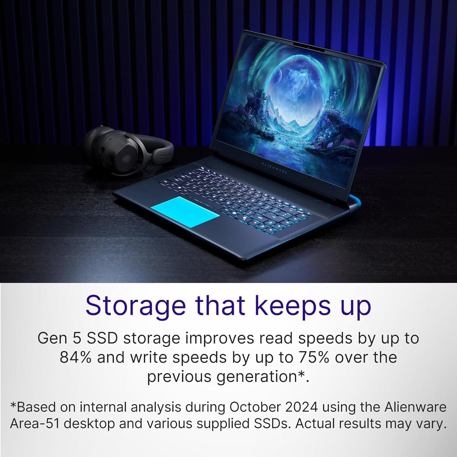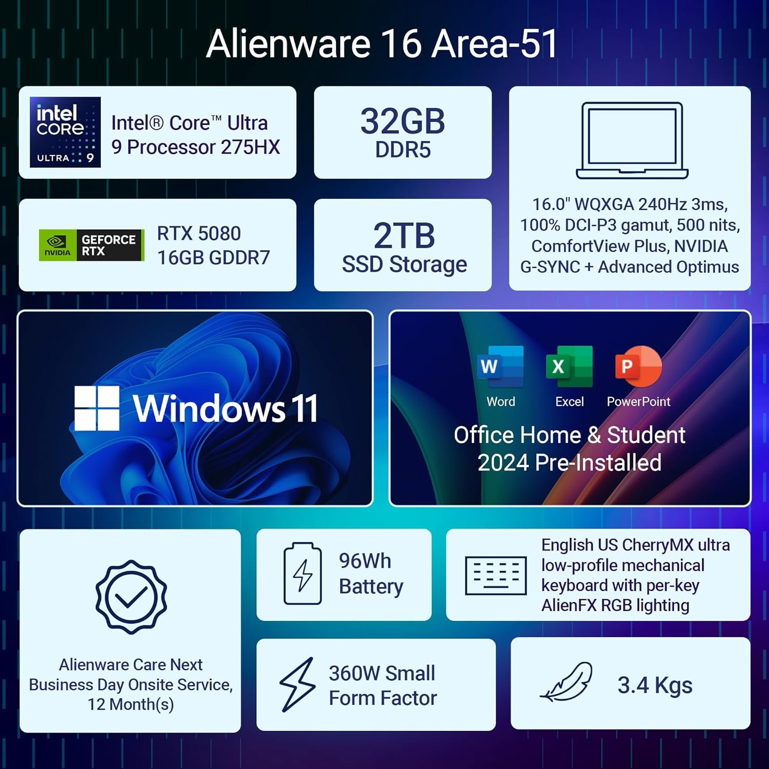Alienware 16 Area-51 Gaming Laptop, AI Enabled Core Ultra 9 275HX Proc, 32GB DDR5, 2TB SSD, RTX 5080 16GB GDDR7 Graphics, 16.0 WQXGA 240Hz 500 nits Display, Liquid Teal Color, Win 11 + MSO24,3.4kg