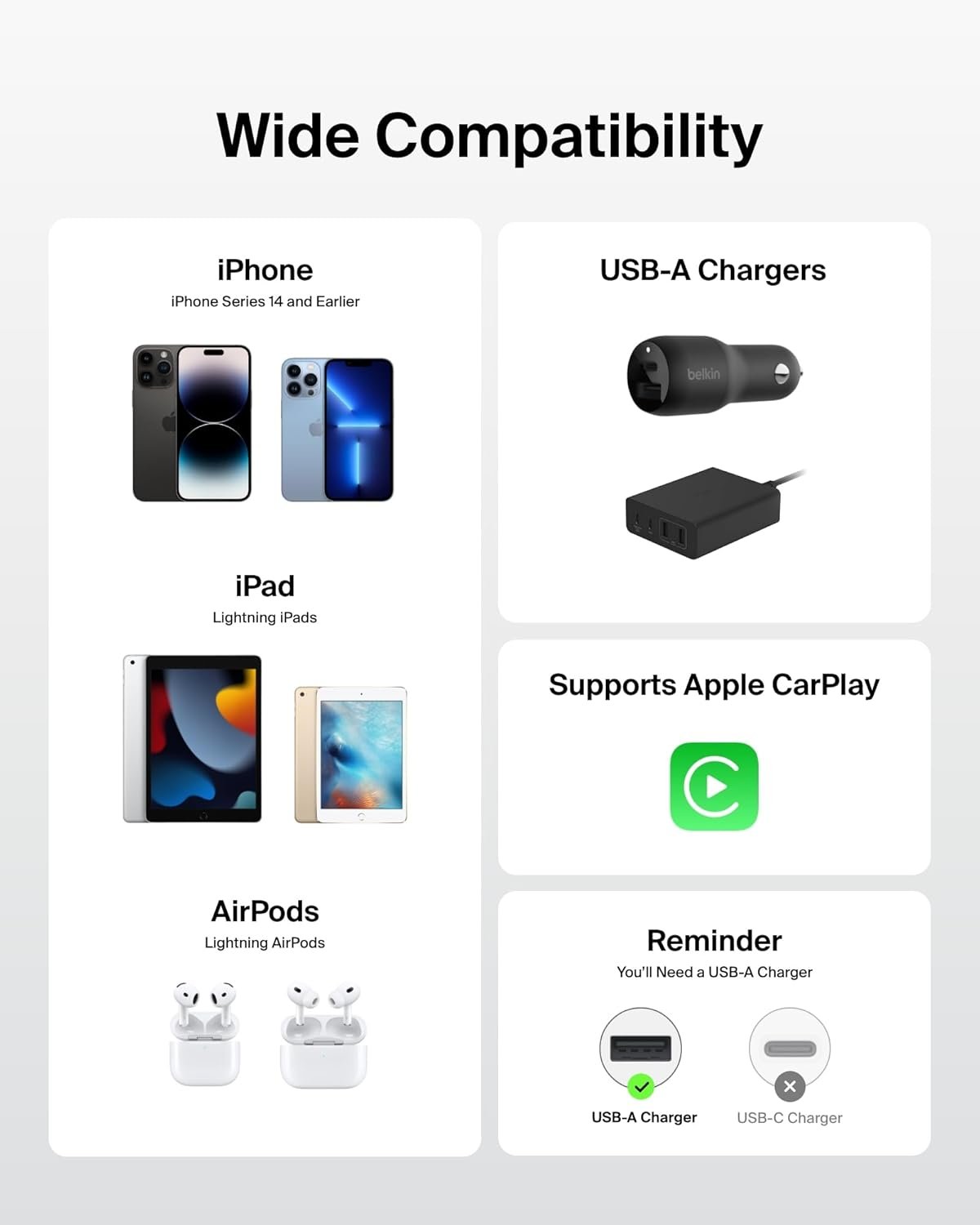 | Compatible Phone Models | Works with iPad devices 9th generation and earlier. iPad Air 3 iPad mini 5th Gen iPad 8th gen iPad 9th gen iPad Pro (10.5″) iPad Pro (12.9″) 2nd Gen iPhone 14 iPhone 14 Pro iPhone 14 Plus iPhone 14 Pro Max iPhone 13 iPhone 13 mini iPhone 13 Pro iPhone 13 Pro Max iPhone 12 iPhone 12 mini iPhone 12 Pro iPhone 12 Pro Max iPhone 11 iPhone 11 Pro iPhone 11 Pro Max iPhone X iPhone XR iPhone XS iPhone XS Max iPhone 8 iPhone 8 Plus iPhone SE 2nd Gen |