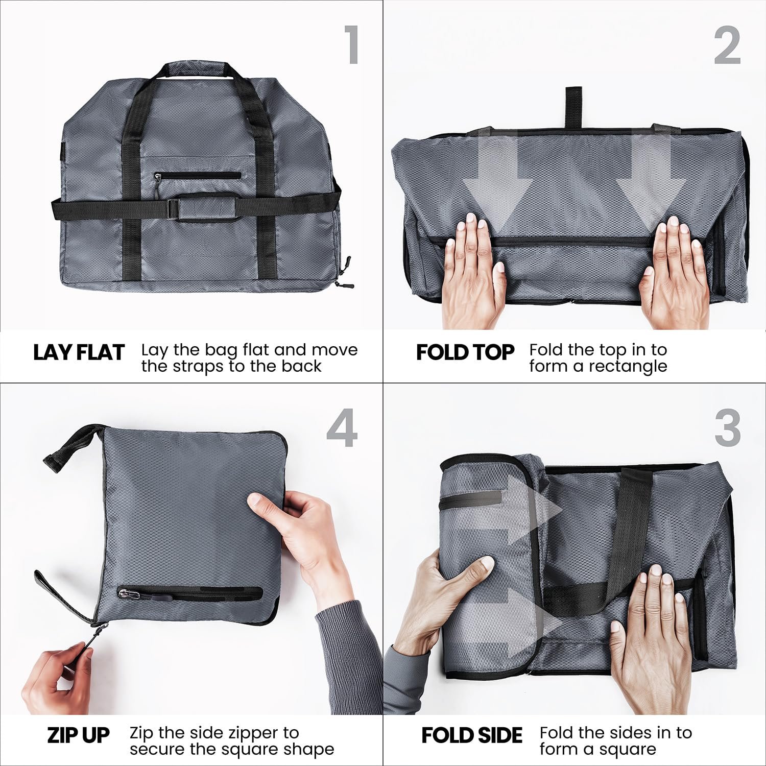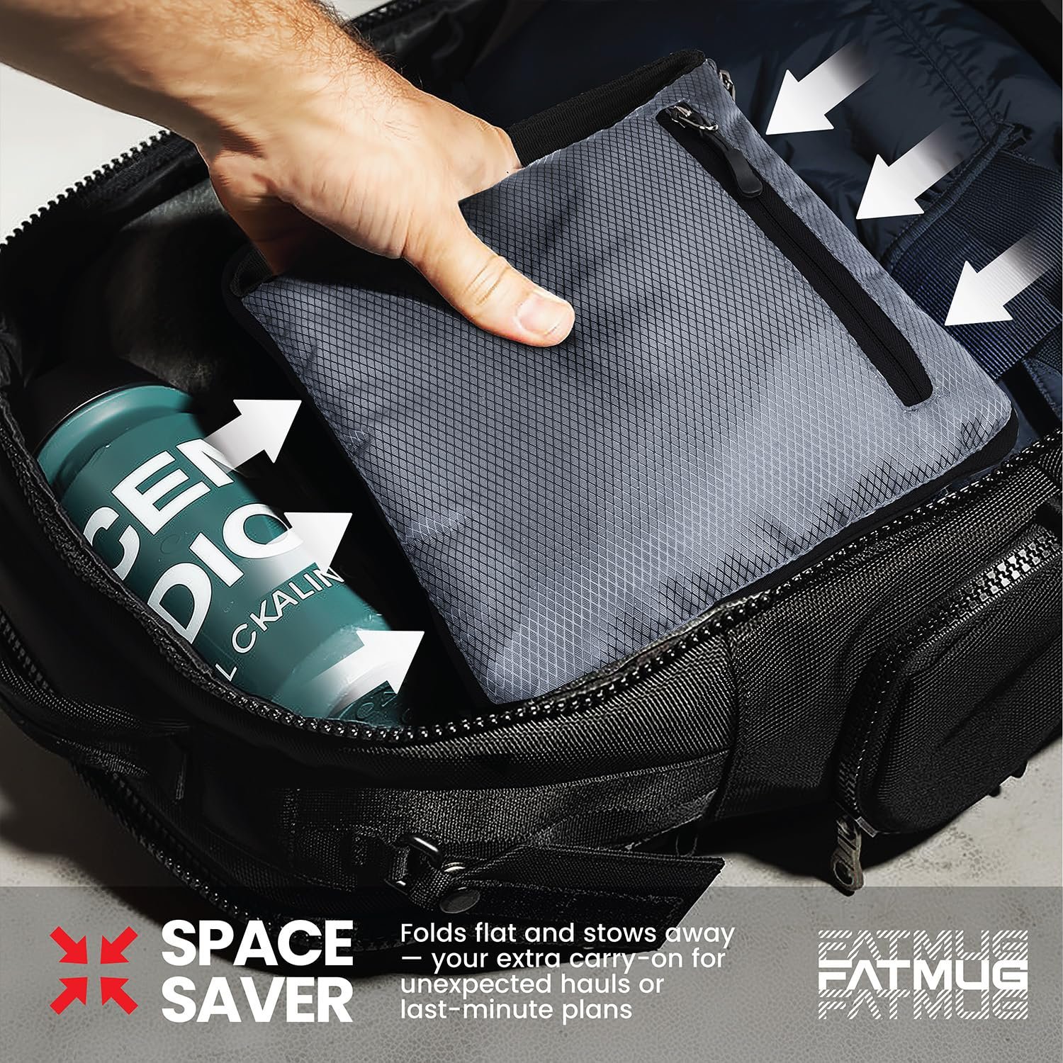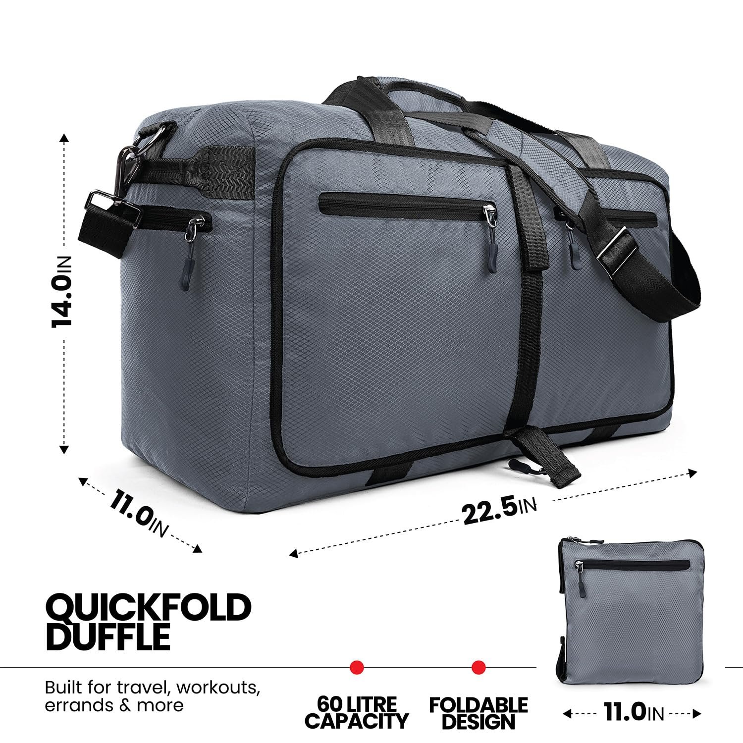- FOLDABLE AND SPACIOUS: Capacity 60L. Unfolded Size: 22.5x14x11 inch, Folded Pouch Size: 11×11 inch