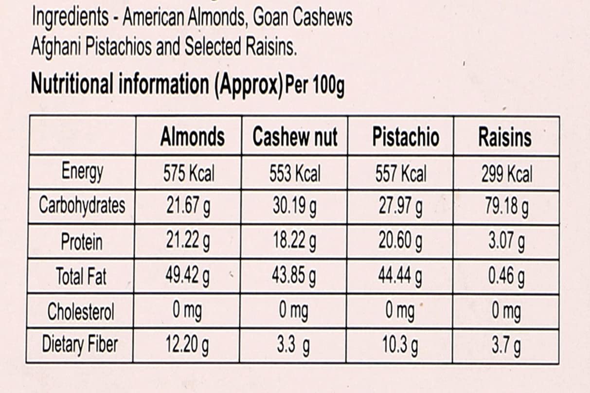 Ingredients cashews, almonds,raisins, and pistachios