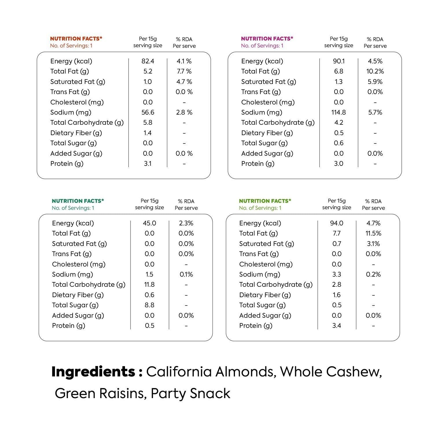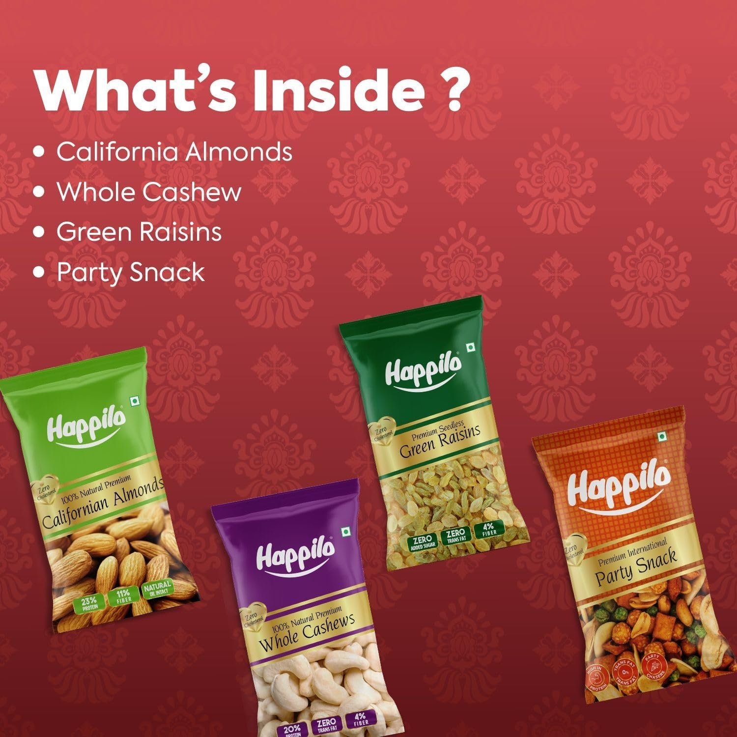 - Premier Selection: The Celebration Gift Box Kiwi boasts a selection of California Almonds, Whole Cashews, Roasted & Salted California Pistachios, Oven Roasted Barbeque Almonds, Healthy Nutmix, and Seedless Green Raisins.