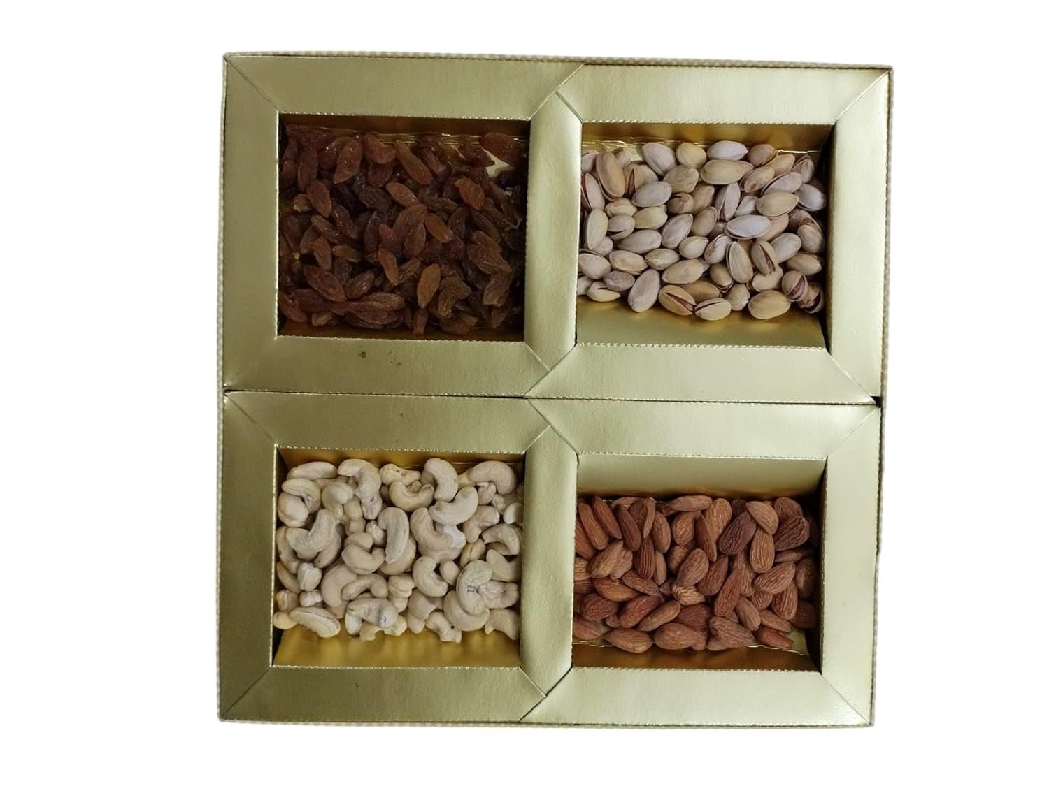 • Assorted Premium Dry Fruits: Contains 100g each of premium quality Almonds, Cashews, Raisins, and Pistachios, packed with nutrients and rich flavors.