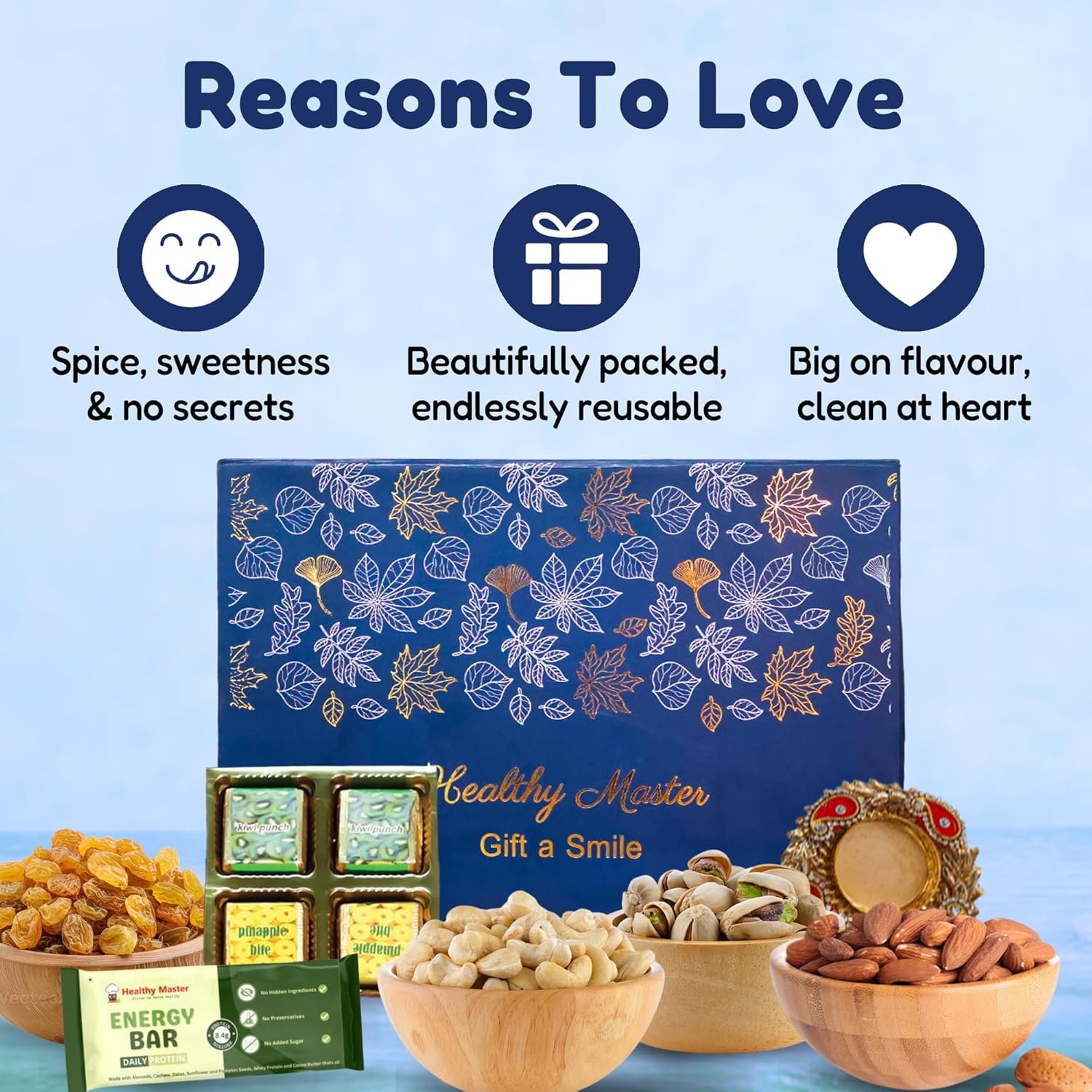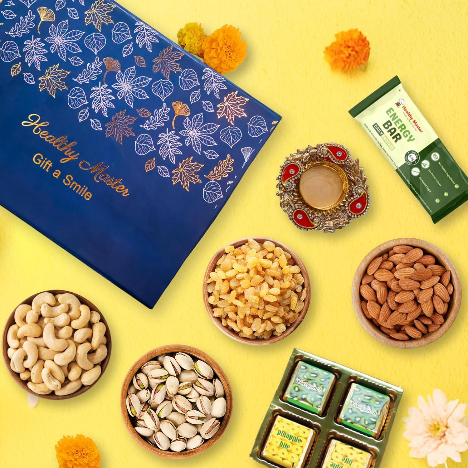 - A BALANCE OF HEALTH, FLAVOR, AND FESTIVITY: Almonds (100 g), Cashews (100 g), Pista (100 g), Kismis (100 g): Premium dry fruits for nutrition, wellness, and prosperity. Daily Protein Energy Bar (1 pc): A wholesome, healthy snack for energy and vitality. Chocolates (4 pcs): Indulgent bites to satisfy festive cravings. Designer Diya (1 pc): Adds a traditional touch, bringing light and positivity to celebrations. ELEGANT FESTIVE PRESENTATION: Encased in a premium Diwali gift box, the Diwali Dream Collection combines elegance, care, and festive charm. Its thoughtfully curated contents make it an unforgettable gift hamper for any occasion.