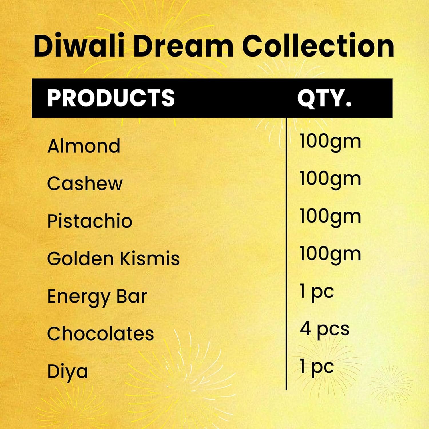 - A DREAMY DIWALI OF HEALTH AND INDULGENCE: The Diwali Dream Collection is a thoughtfully curated hamper that brings together festive joy, health, and indulgence. Featuring premium dry fruits, chocolates, a protein energy bar, and a beautifully crafted designer diya, this gift pack is perfect for celebrating the festival of lights with loved ones.