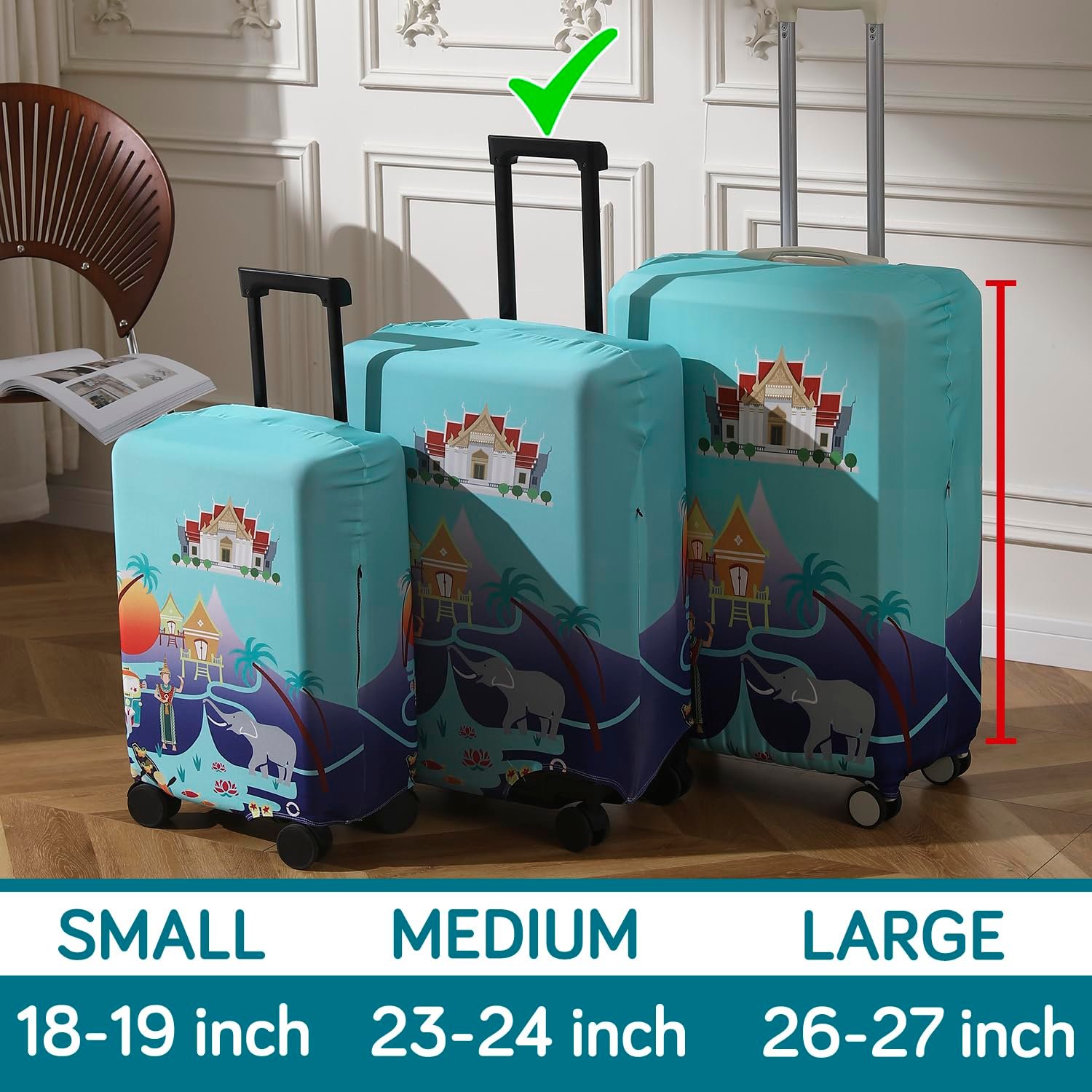- Available for small (18-19inch), medium (23-24inch) and large (26-27inch) trolley suitcase. Size measured is from base of suitcase till top (excluding wheels)