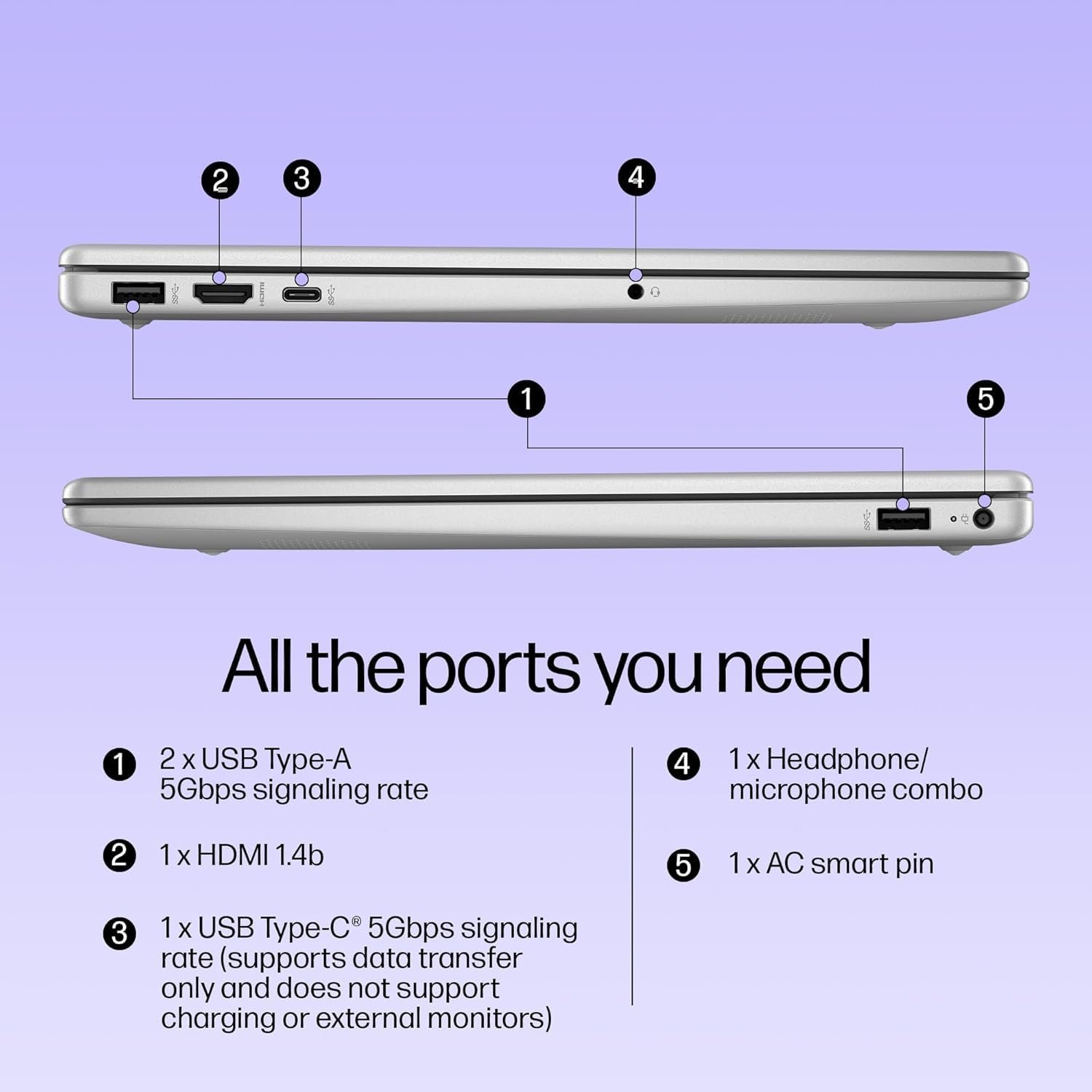 • Ports & Connectivity :1 USB Type-C 5Gbps signaling rate (supports data transfer only and does not support charging or external monitors); 2 USB Type-A 5Gbps signaling rate; 1 AC smart pin; 1 HDMI 1.4b; 1 headphone/microphone combo| Connectivity: Realtek Wi-Fi 6 (2×2) and Bluetooth 5.3 wireless card (supporting gigabit data rate)