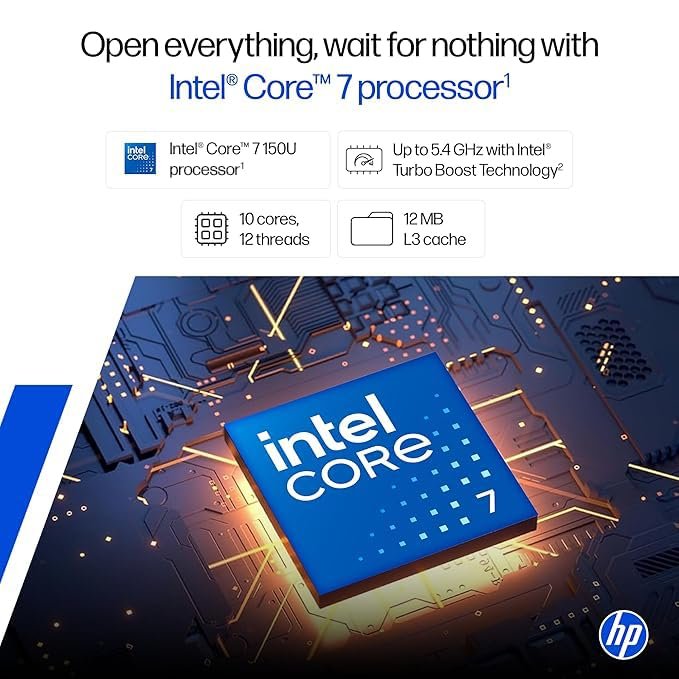 - Processor, Memory & Storage: Intel Core 7 150U (up to 5.4 GHz with Intel Turbo Boost Technology, 12 MB L3 cache, 10 cores, 12 threads)| Memory: 16 GB LPDDR5-5200 MT/s (onboard)| Storage: 1 TB PCIe Gen4 NVMe M.2 SSD