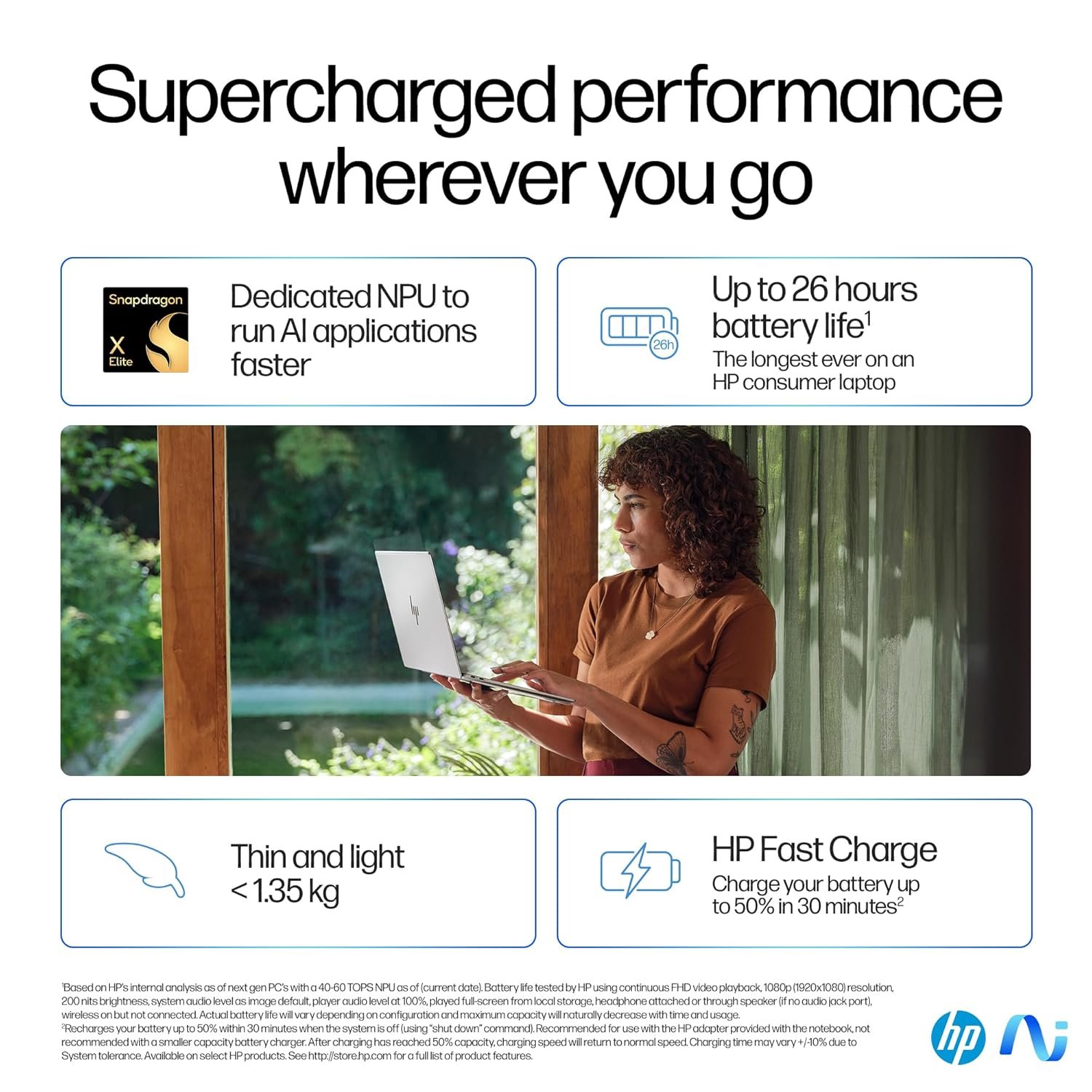 - 【Qualcomm integrated SoC】Full-size, backlit, soft grey keyboard; Qualcomm FastConnect 7800 Wi-Fi 7 (2×2) High Band Simultaneous (HBS) and Bluetooth 5.4 wireless card, 1 USB Type-A 10Gbps signaling rate (HP Sleep and Charge); 1 headphone/microphone combo; 1 USB Type-C 10Gbps signaling rate (USB Power Delivery, DisplayPort 1.4a, HP Sleep and Charge); 1 USB Type-C