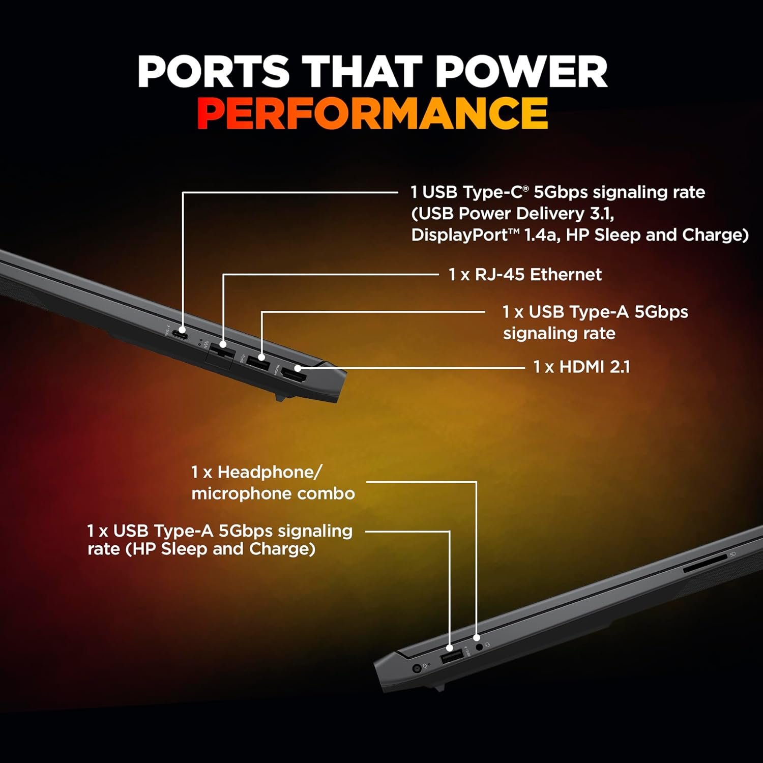 - Ports & Connectivity :1 USB Type-A 5Gbps signaling rate (HP Sleep and Charge); 1 USB Type-A 5Gbps signaling rate; 1 AC smart pin; 1 HDMI 2.1; 1 headphone/microphone combo; 1 RJ-45; 1 USB Type-C 5Gbps signaling rate (USB Power Delivery 3.1, DisplayPort 1.4a, HP Sleep and Charge)| Wireless: Realtek Wi-Fi 6 (2×2) and Bluetooth 5.4 wireless card