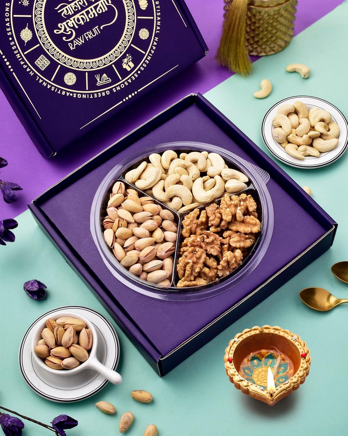 Illuminate the festival of Diwali with our Mandala Dry Fruits Gift Tray, a blend of art, tradition, and premium indulgence. Designed with intricate mandala patterns symbolizing balance and prosperity, this tray captures the essence of the festival while offering a nourishing selection of the finest dry fruits.