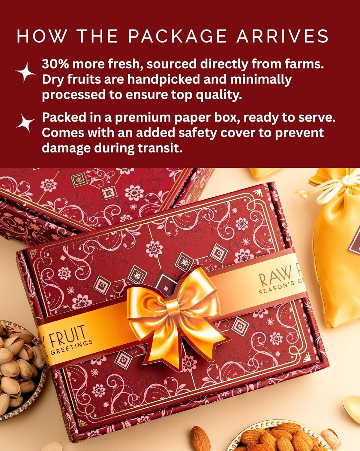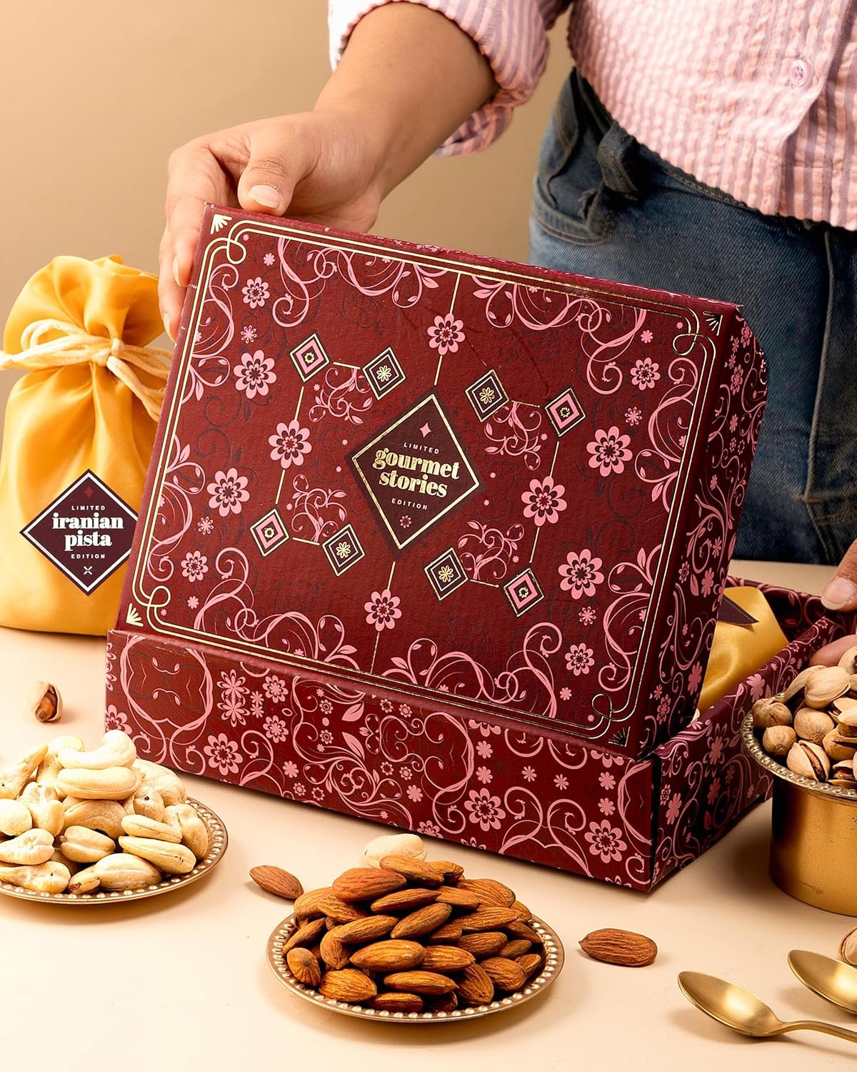- Diwali Gift Hamper : Cashews, Almonds & Pistachios (100gm Each), Packed in Golden Potli.