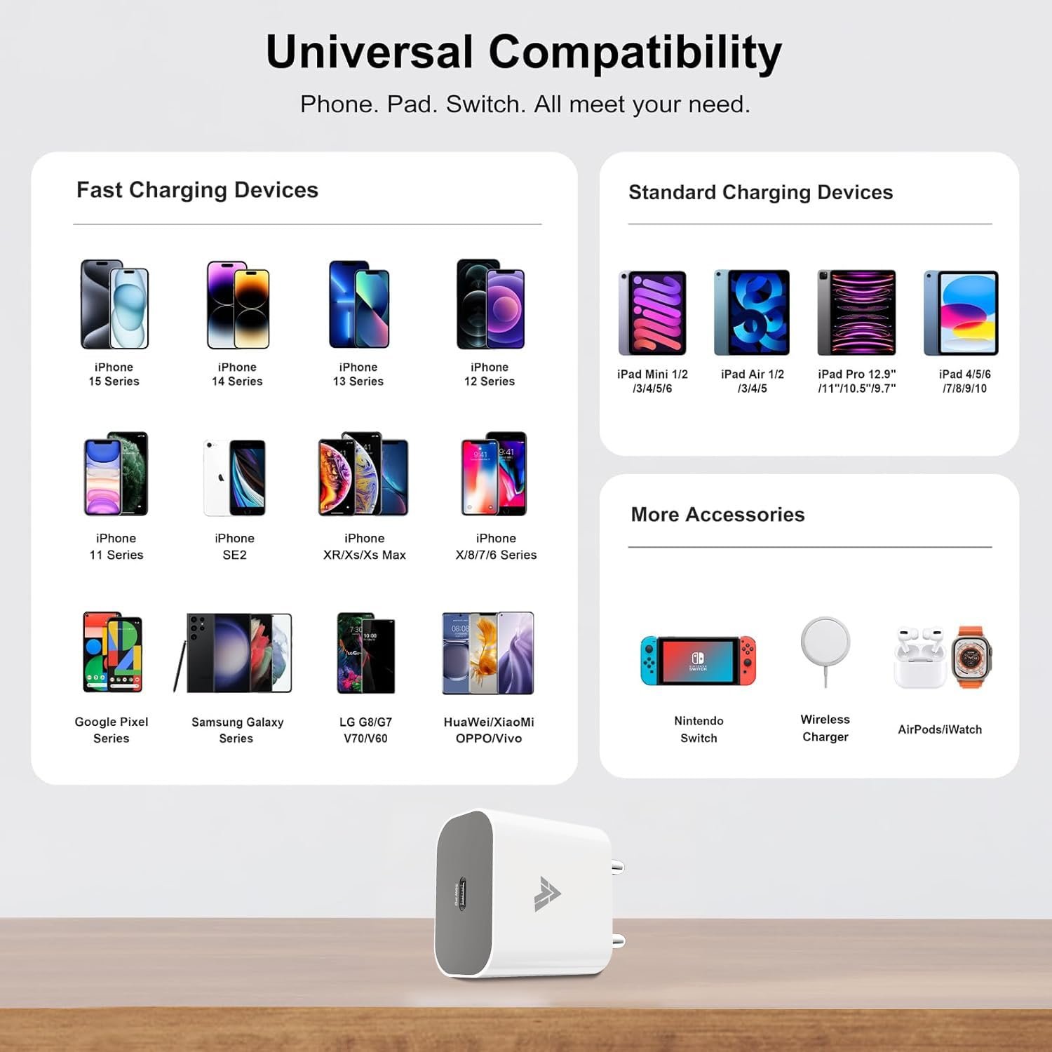 - 【PD】The 20W type C charger fast charging uses Power Delivery and Quick Charge to offer fast efficient charging. You can pair it with iPhone 17/16/15/14/13/12/11/X, etc. to take advantage of the fast-charging feature, charging up to 50% in around 30 minutes. PD Quick-Charge USB C port provides Max 20W output power. Great for Android and iOS devices.