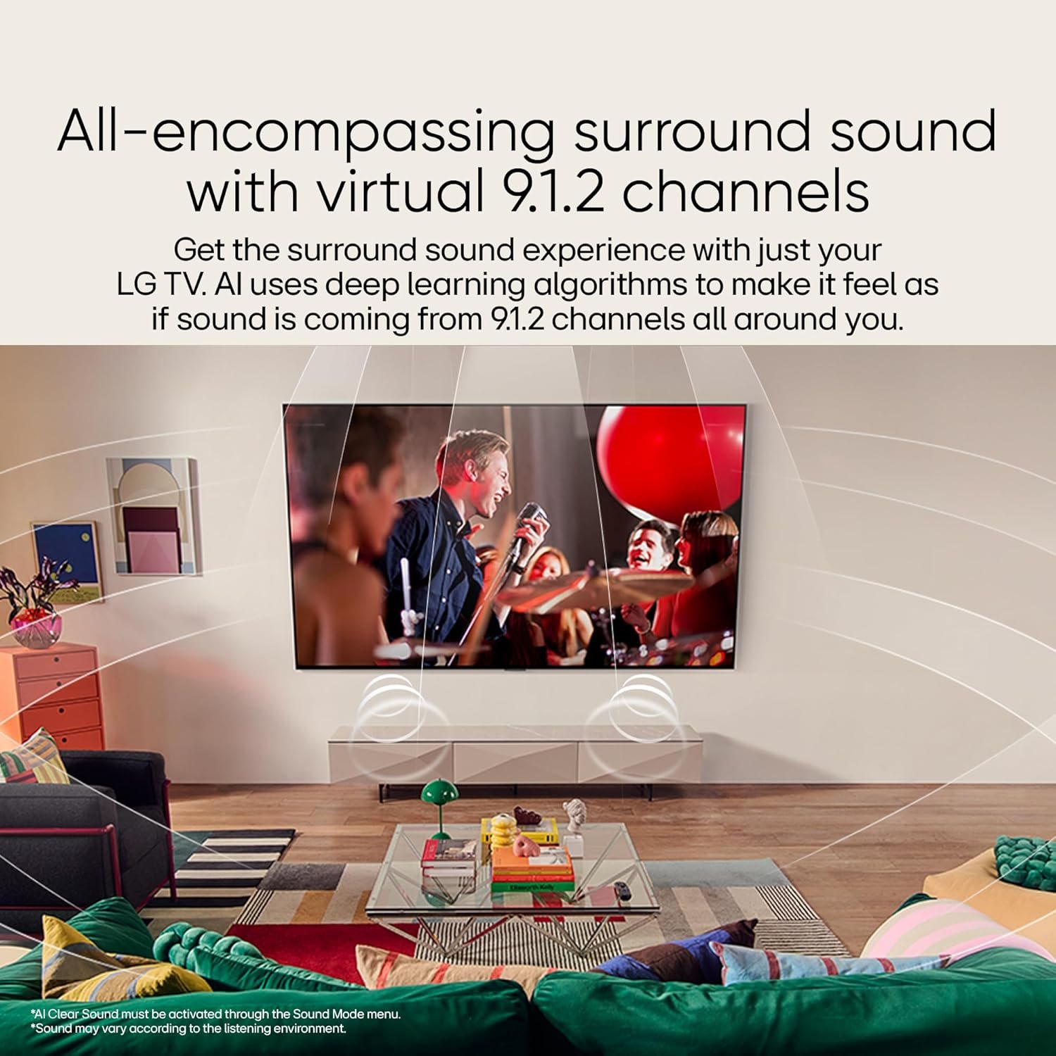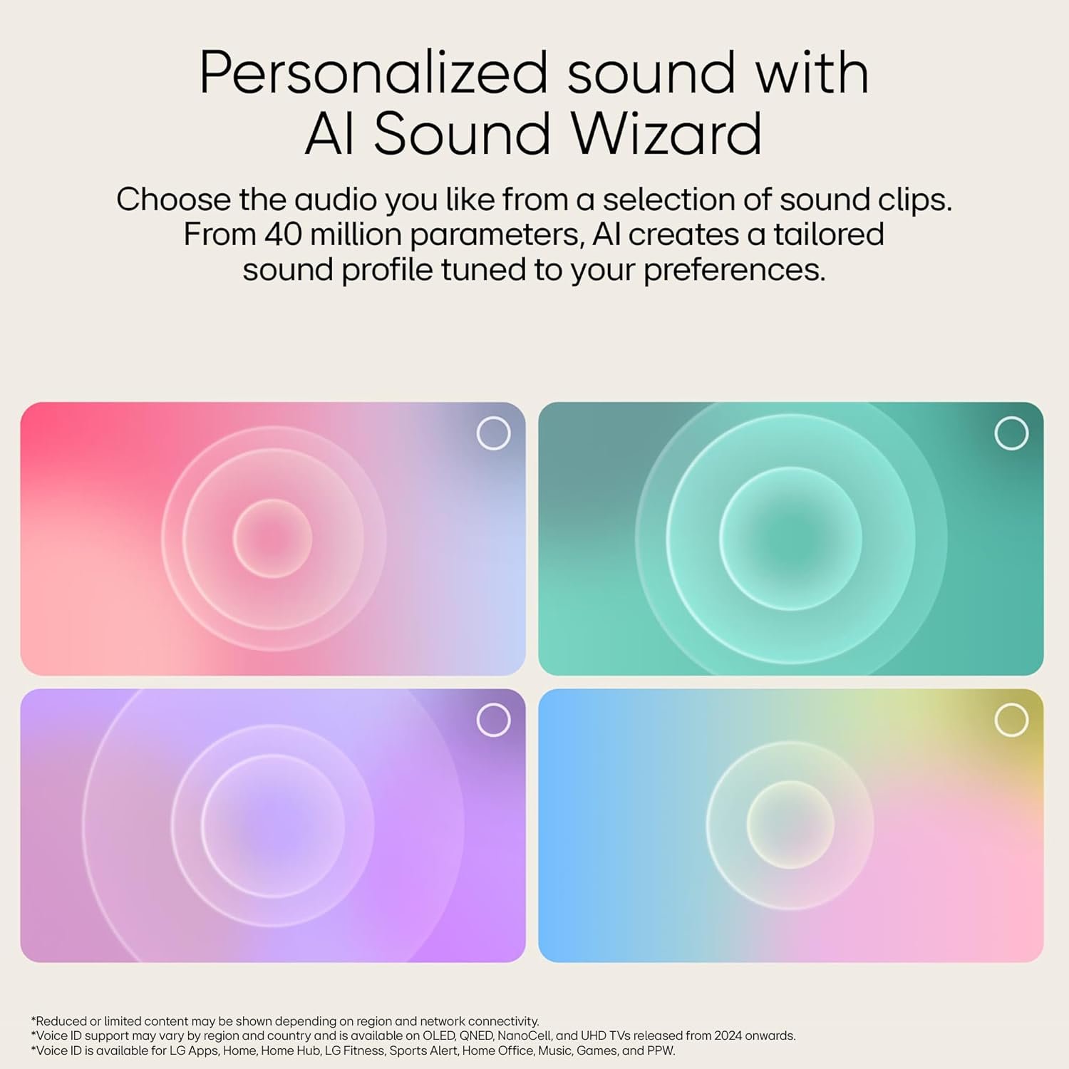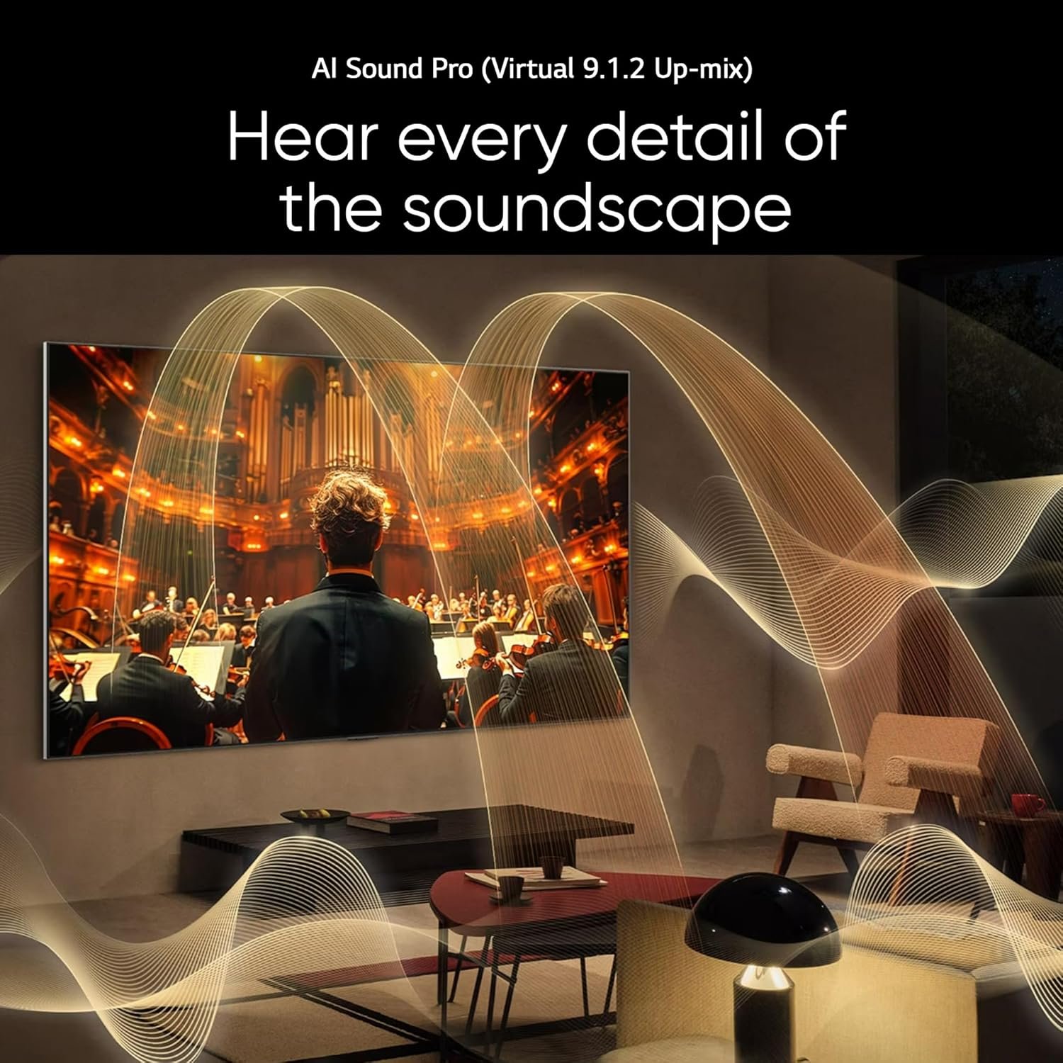 • Sound: 20 Watts Output | AI Sound Pro (Virtual 9.1.2 Up-mix) | Dolby Atmos | Clear Voice Pro (Auto Volume Leveling) | AI Acoustic Tuning | LG Sound Sync | Bluetooth Surround Ready (2 Way Playback) | WOW Orchestra| Down Firing Speakers
