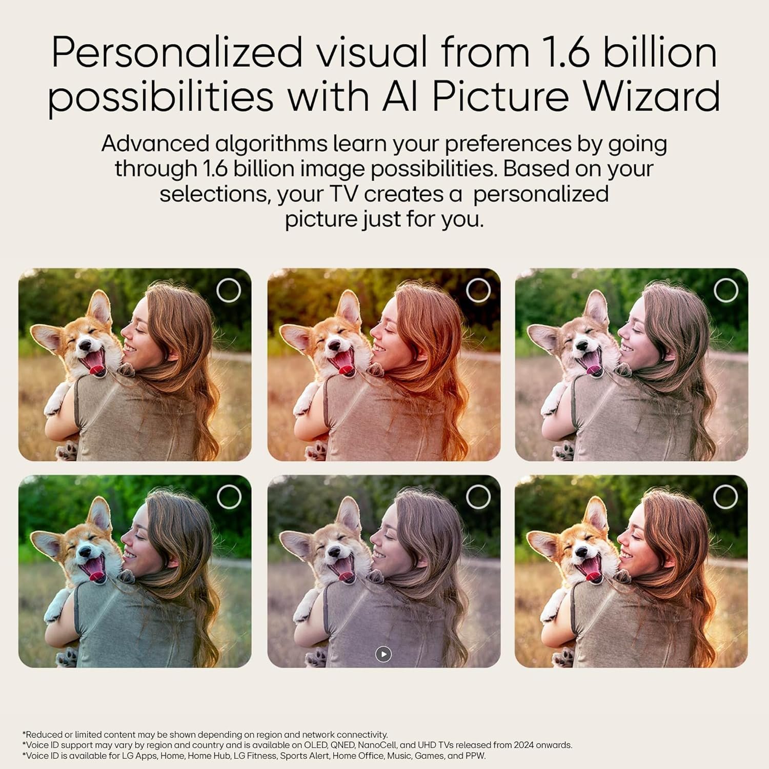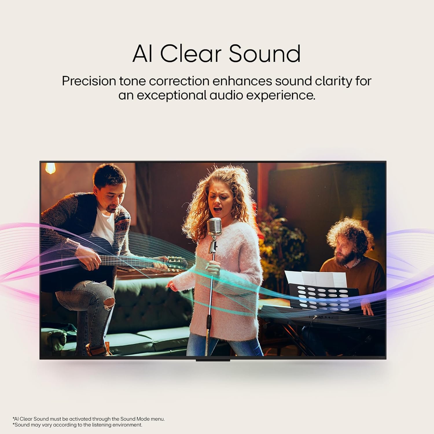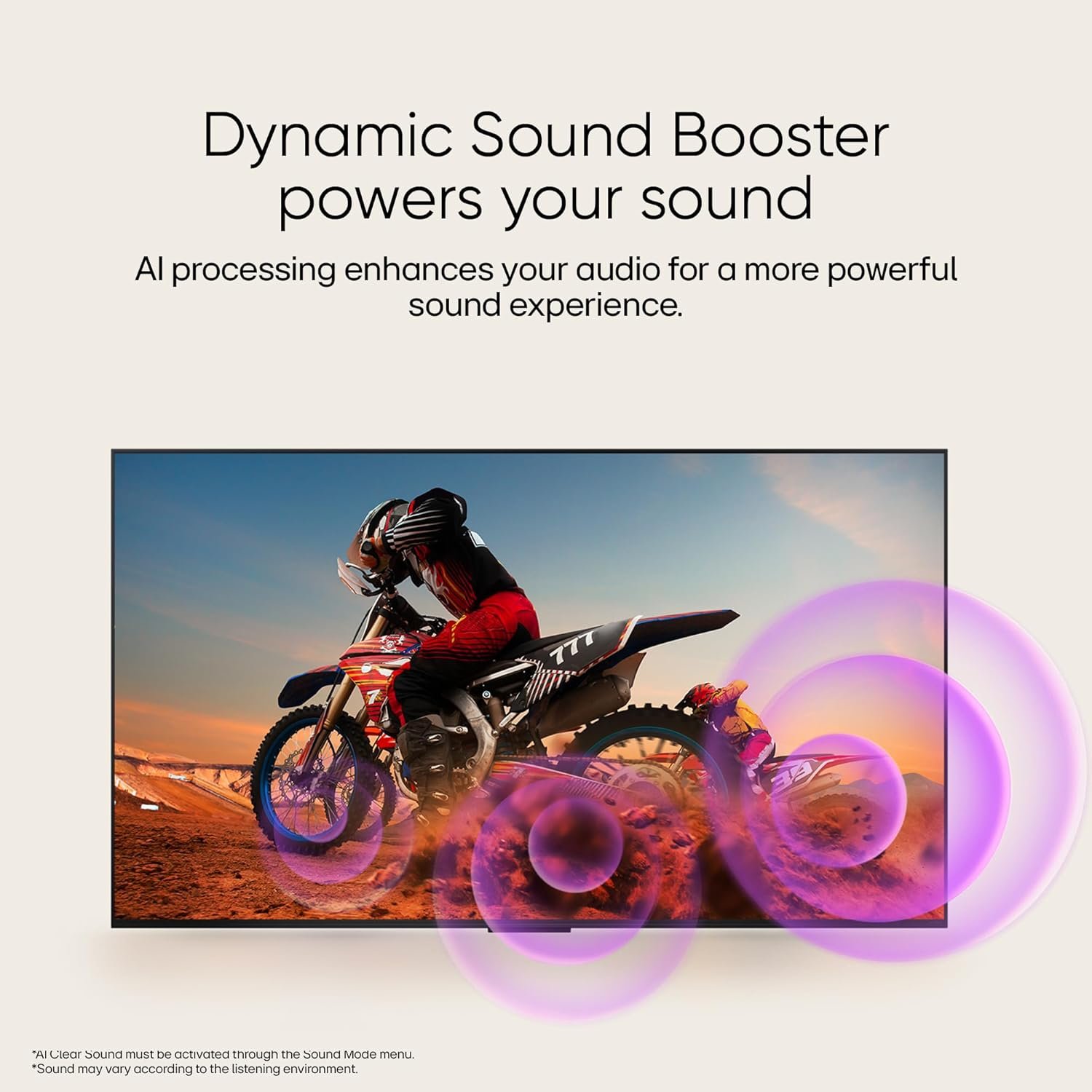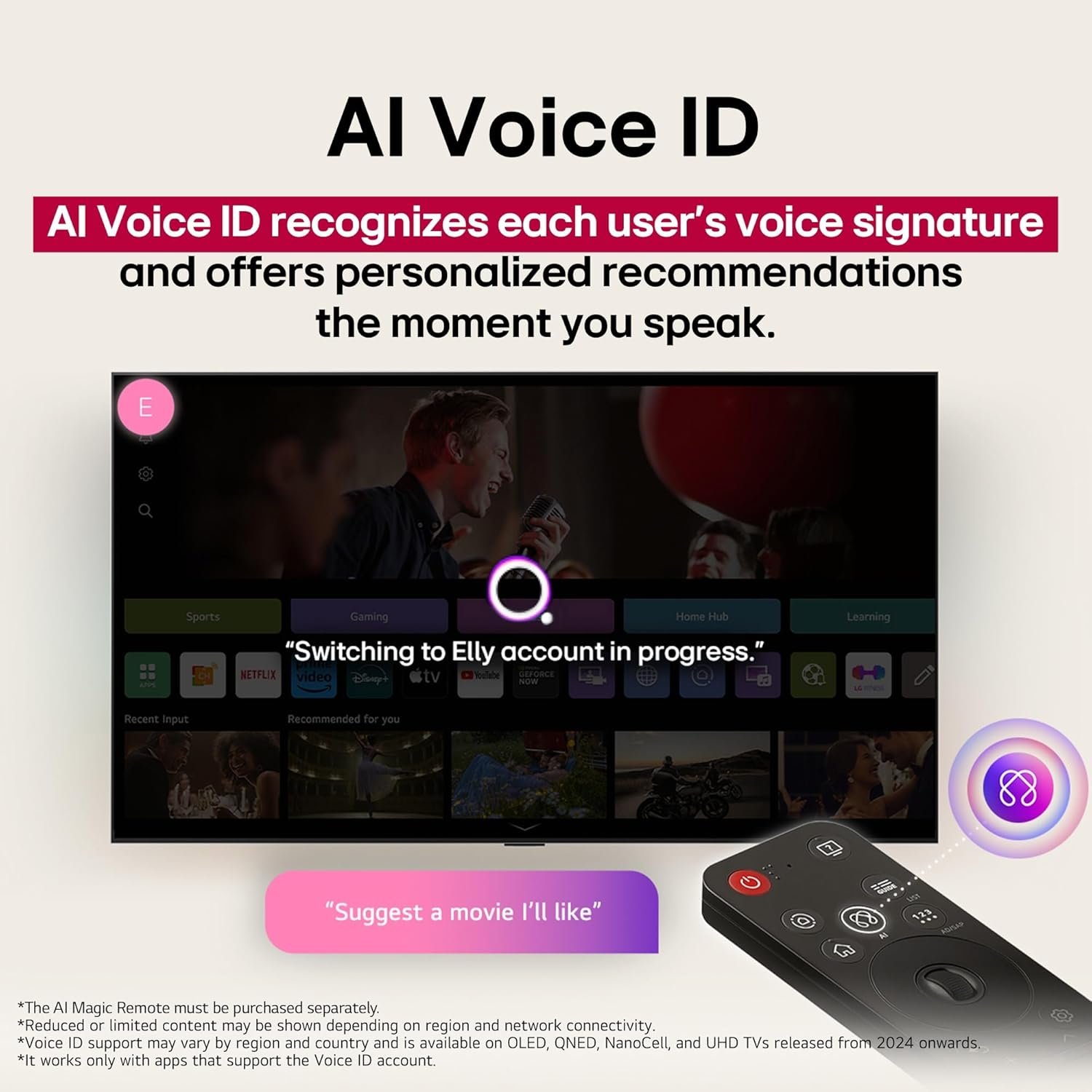 • Sound: 20 Watts Output | AI Sound Pro (Virtual 9.1.2 Up-mix) | Dolby Atmos | Clear Voice Pro (Auto Volume Leveling) | AI Acoustic Tuning | LG Sound Sync | Bluetooth Surround Ready (2 Way Playback) | WOW Orchestra| Down Firing Speakers