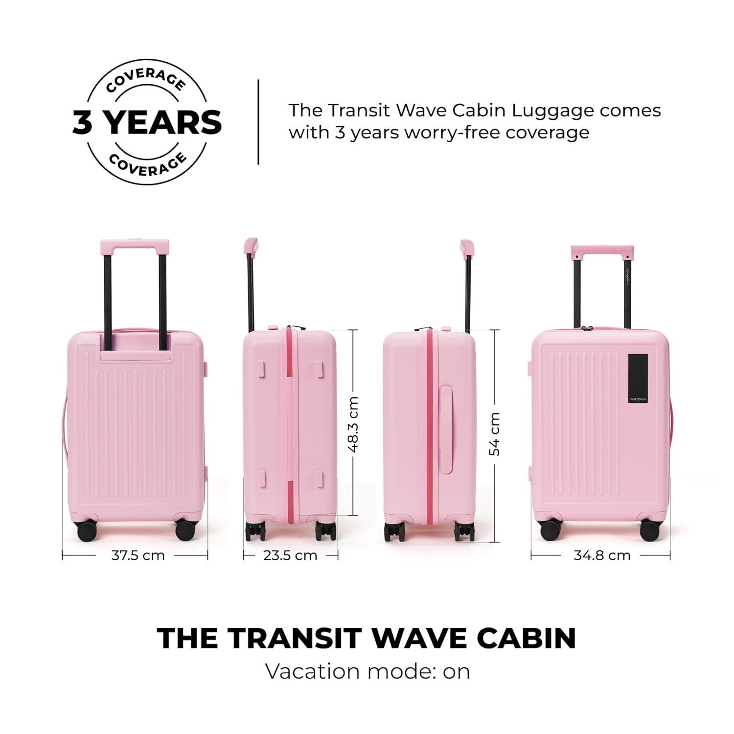 Telescope handle It’s incredibly easy to maneuver. Adjust the handle height to three different levels Super silent ninja wheels Comes with 8 silent-run Japanese Hinomoto wheels that glide like butter Suitcase feet Elevated suitcase feet that keep your luggage scratch-free and off the ground Built to last Made of a polycarbonate shell that is flexible & practically unbreakable Keyless TSA- approved lock The Transit Wave Cabin is secured with a keyless TSA lock. Simply push the latch towards the numbers to unlock DIMENSIONS WEIGHT & CAPACITY 54 x 37.5 x 23.5 cm; 3.1 Kg; 40 litres