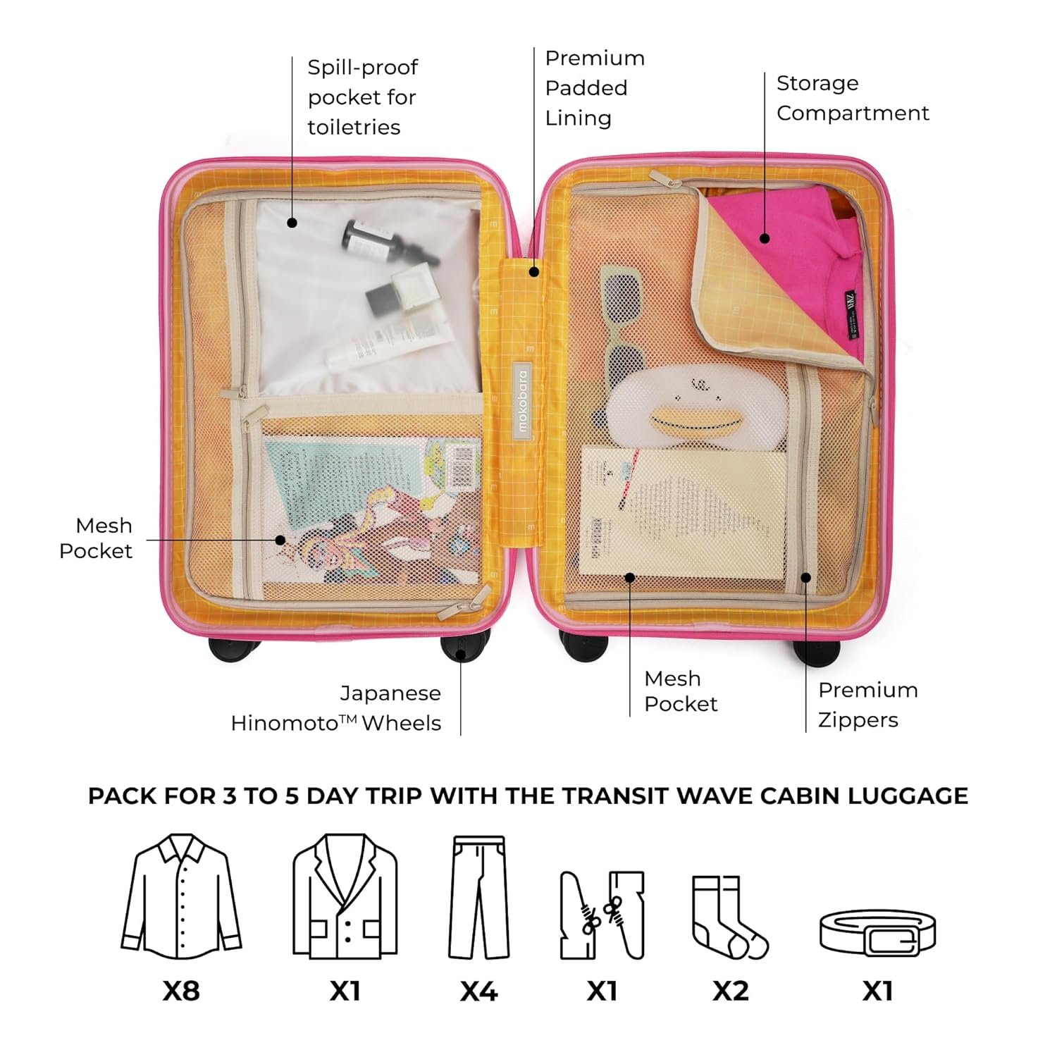 - OPTIMISED ORGANISATION: Features two zippered storage compartments, a spill-proof pocket for your toiletries and an easy access zippered pocket. Packs for a 3 to 5 day trip with ease.