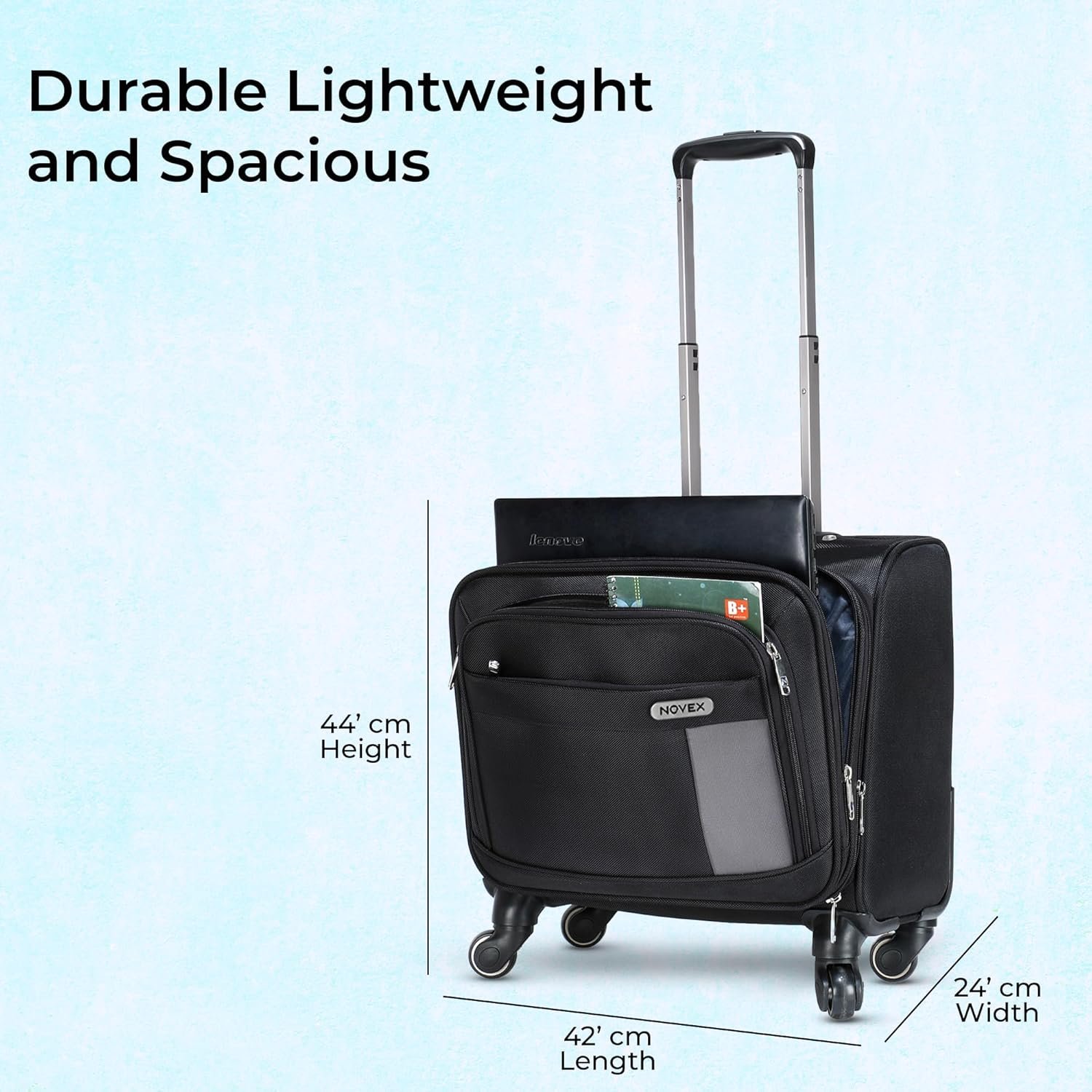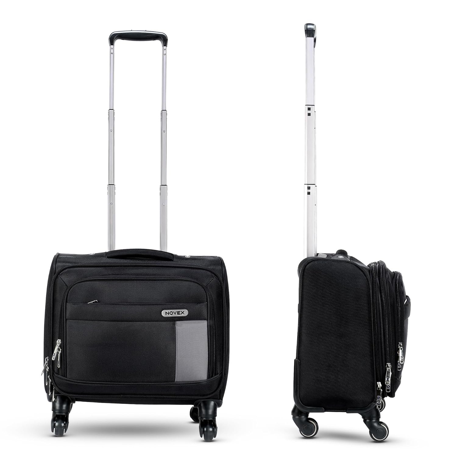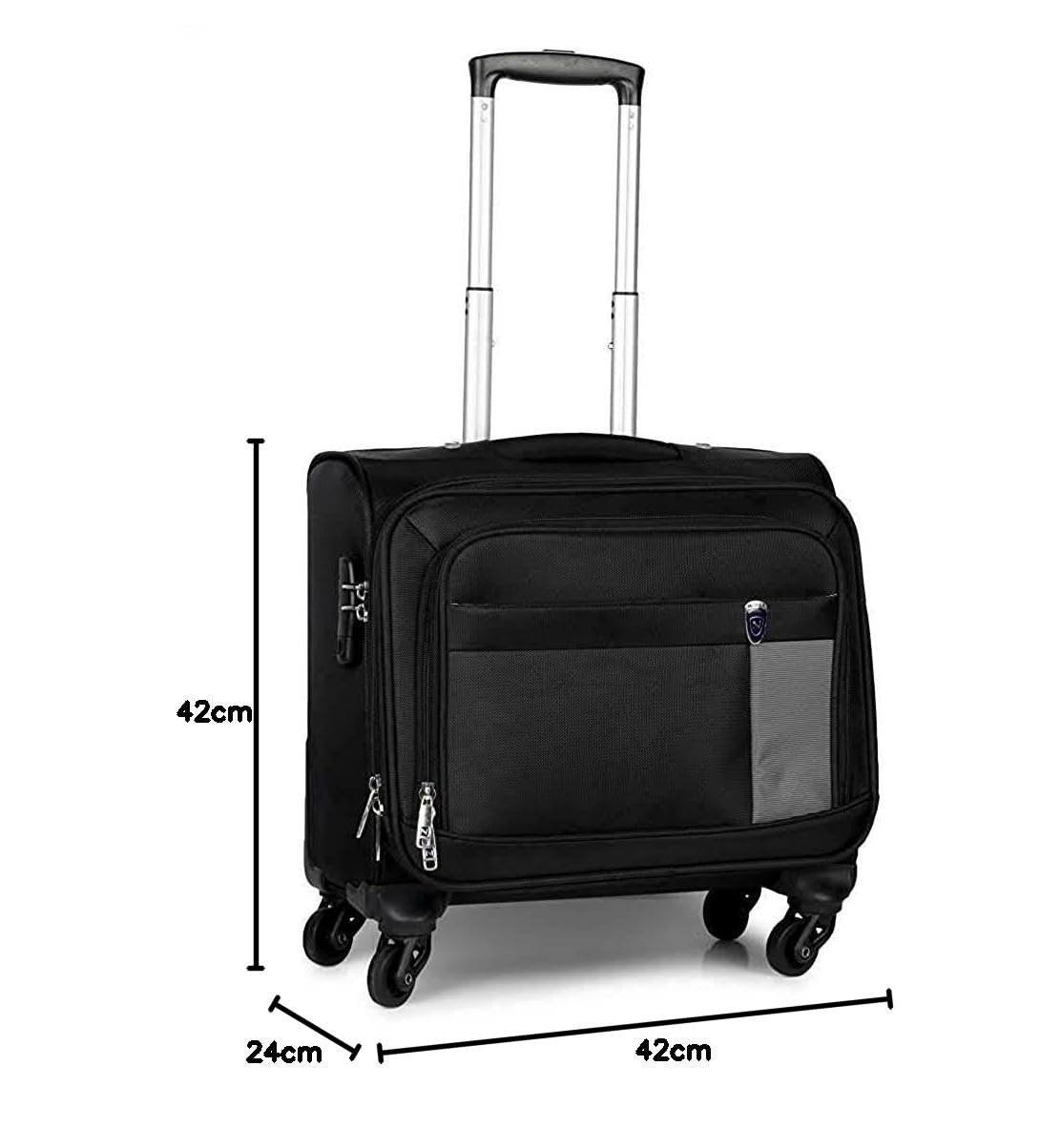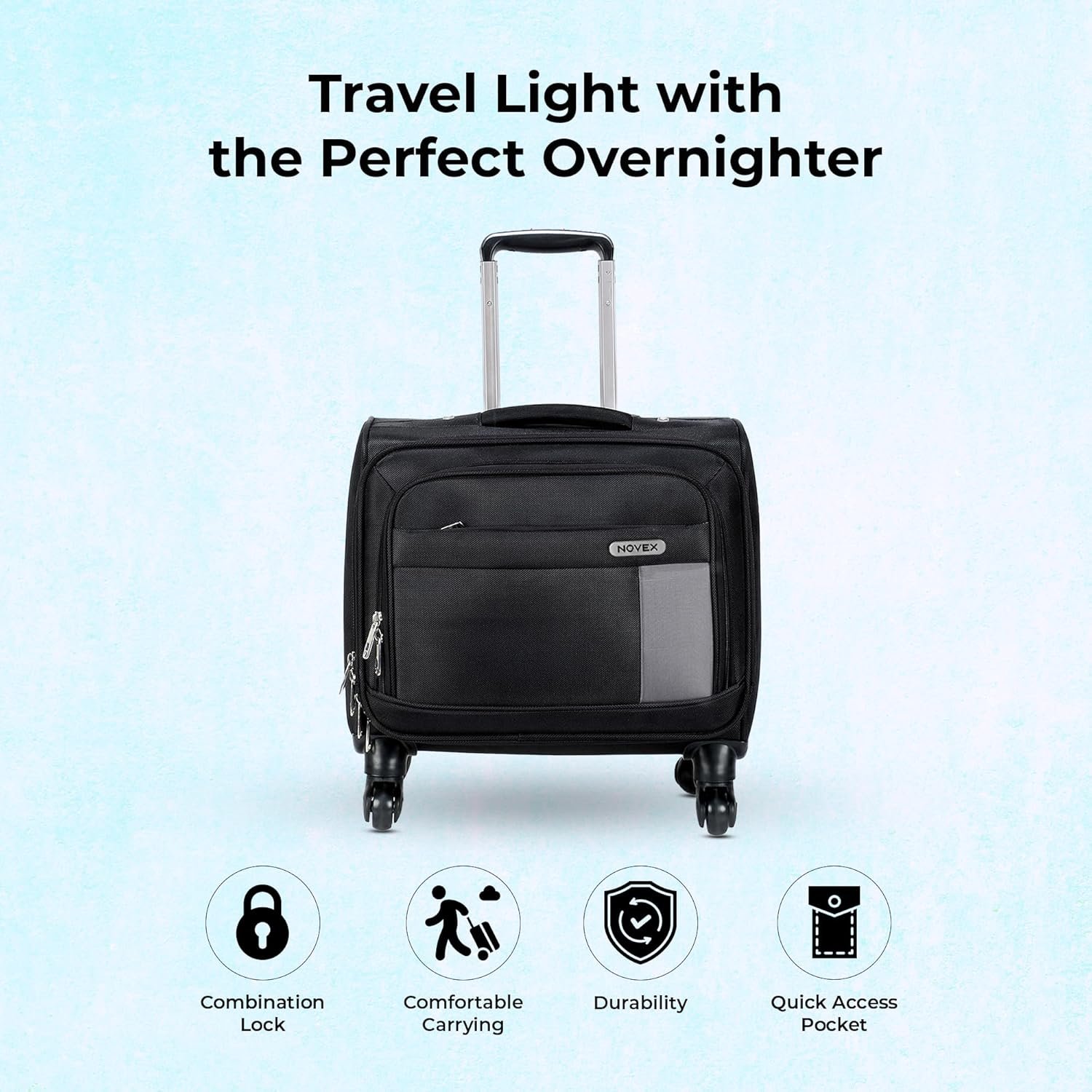 - 【VERSATILE TRAVEL COMPANION】— Whether you’re embarking on a business trip, weekend getaway, or daily commute, the NOVEX Polyester Overnighter Black is a reliable and versatile travel companion that combines convenience, style, and functionality. The NOVEX Polyester Overnighter Black is a compact 42cm laptop trolley bag that combines the functionality of a backpack with the convenience of a rolling luggage. Perfect for overnight trips or daily commutes.