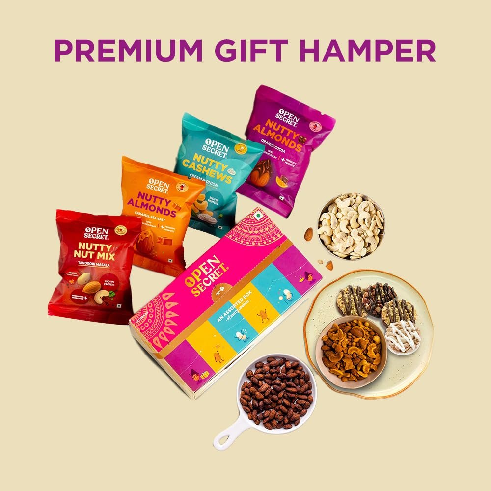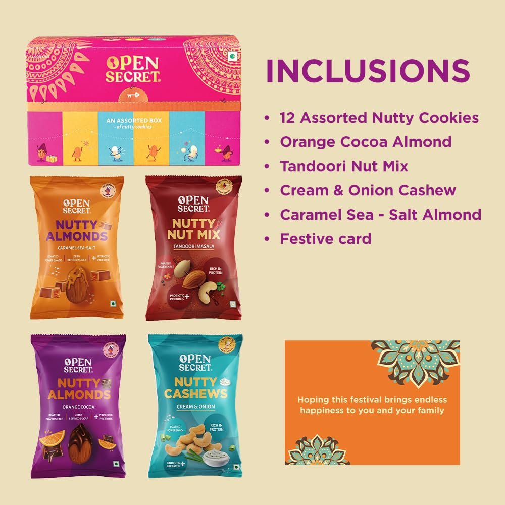 - Festive Gift : Celebrate with Open Secret’s Classic Style Gift Hamper. Experience the Perfect Combination of Healthy Snack Hamper- Assorted Cookies with Nuts, and Exciting Merchandise.