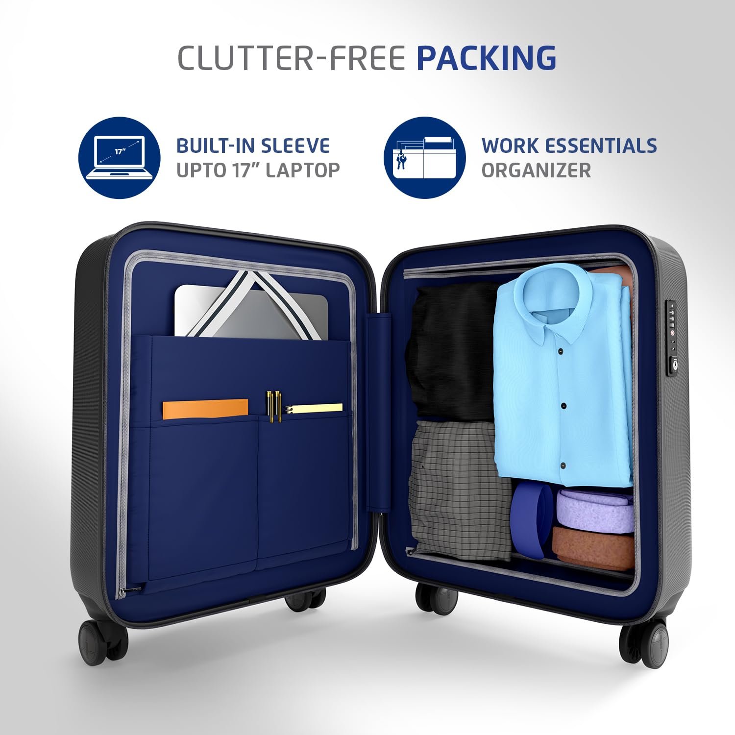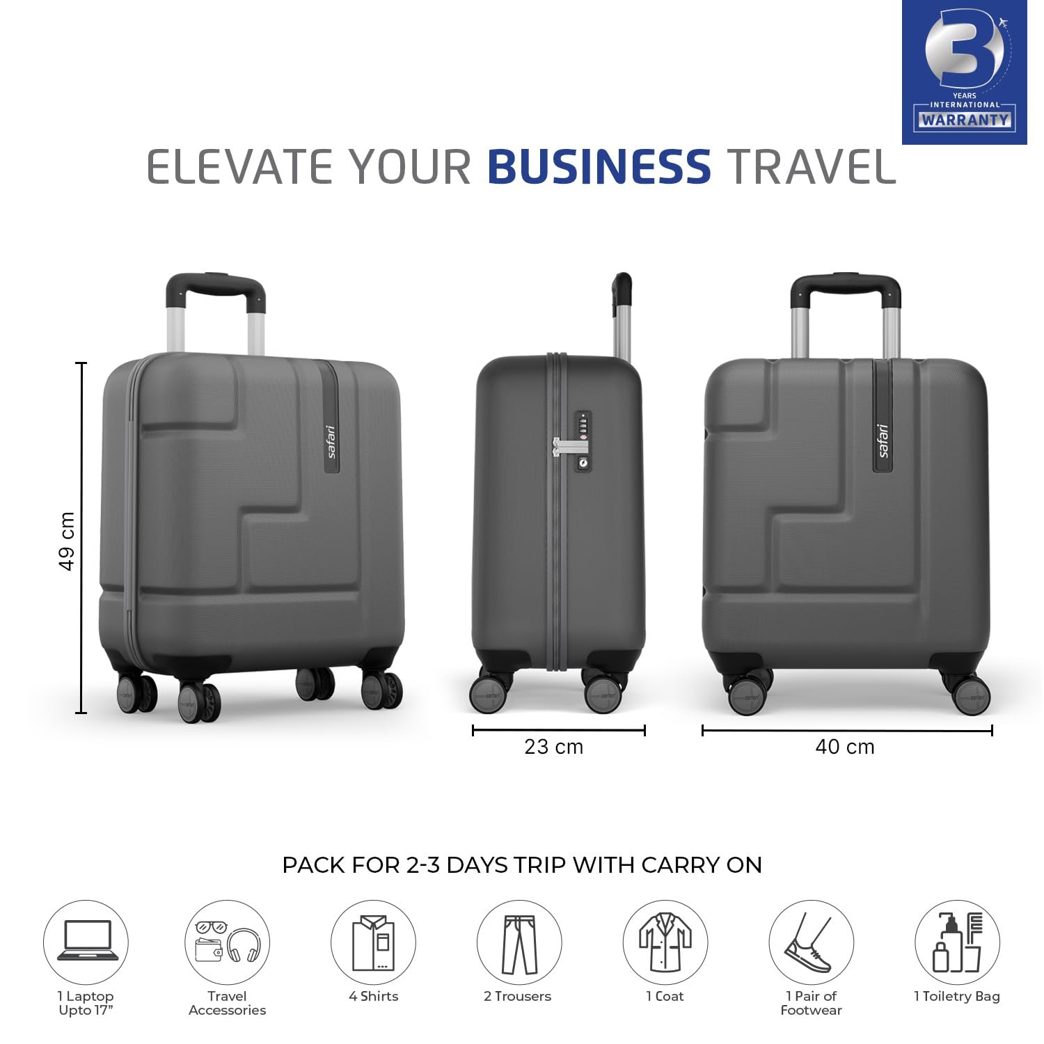 Introducing Safari Aviator Overnighter Laptop Trolley – the perfect blend of functionality and smart styling for the modern business traveller. This trolley is more than just a luggage; it is a statement that reflects your professional style and redefines how you travel. Crafted from unbreakable scratch resistant lightweight polycarbonate material, this trolley not only offers exceptional durability but also elevates your travel aesthetic. The cabin size trolley features a dedicated built-in 17-inch laptop sleeve, providing a snug fit for your device while keeping it easily accessible. Equipped with 360 degree 8 spinner wheels, this trolley glides smoothly through crowded airports and busy city streets. Travel with peace of mind thanks to the globally approved TSA lock for enhanced security. The 3 year International Warranty ensures we have you covered in every trip.