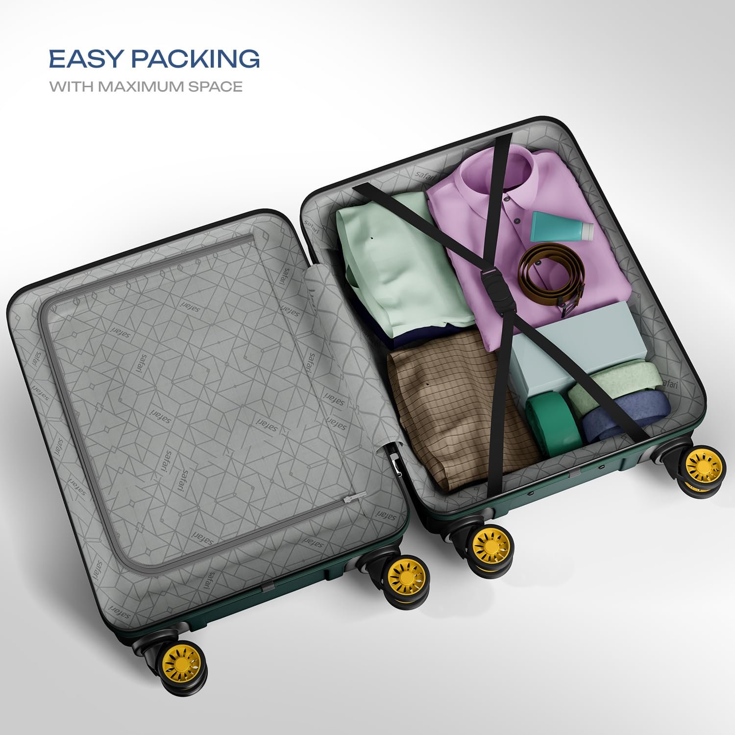 Introducing Safari Pentagon Pro – Designed to turn heads. Crafted from premium polypropylene material, this durable yet lightweight trolley bag is designed to withstand the rigors of modern travel. The advanced 8 wheel design offers 360 degree smooth rolling across all terrains. Travel with peace of mind thanks to the 3 digit combination lock and sturdy zippers for enhanced security. The 3 years International Warranty ensures we have you covered in every trip.