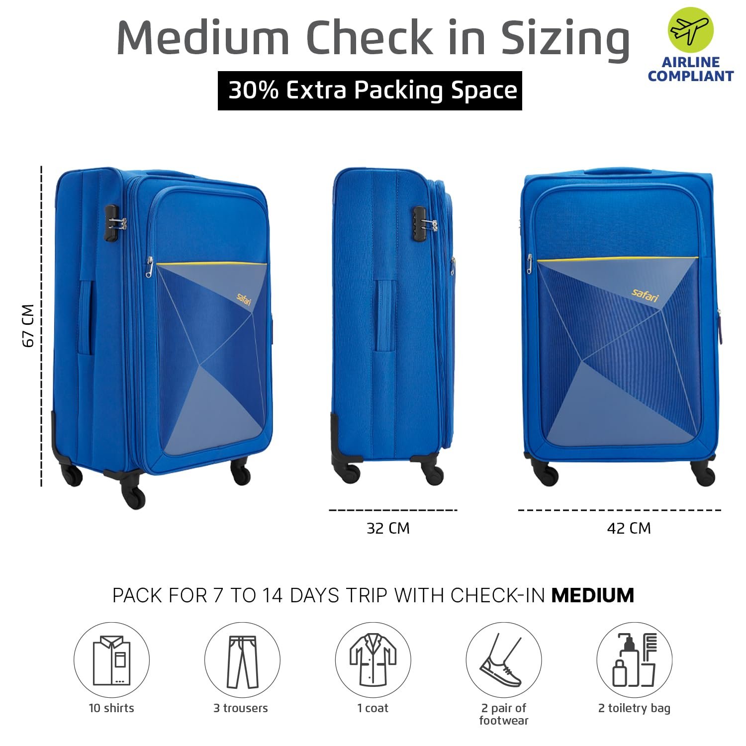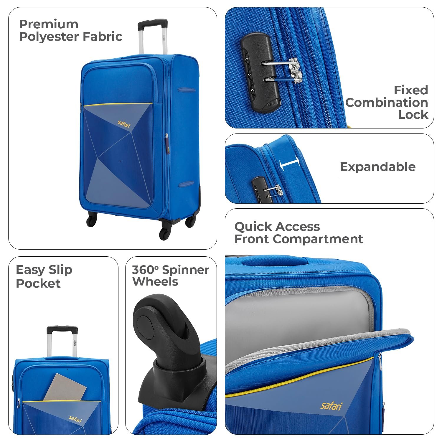 • Included Components : Safari Polyester 65 cms Blue Softsided Check-in Luggage (PRISMA654WBLU)-26 Inch