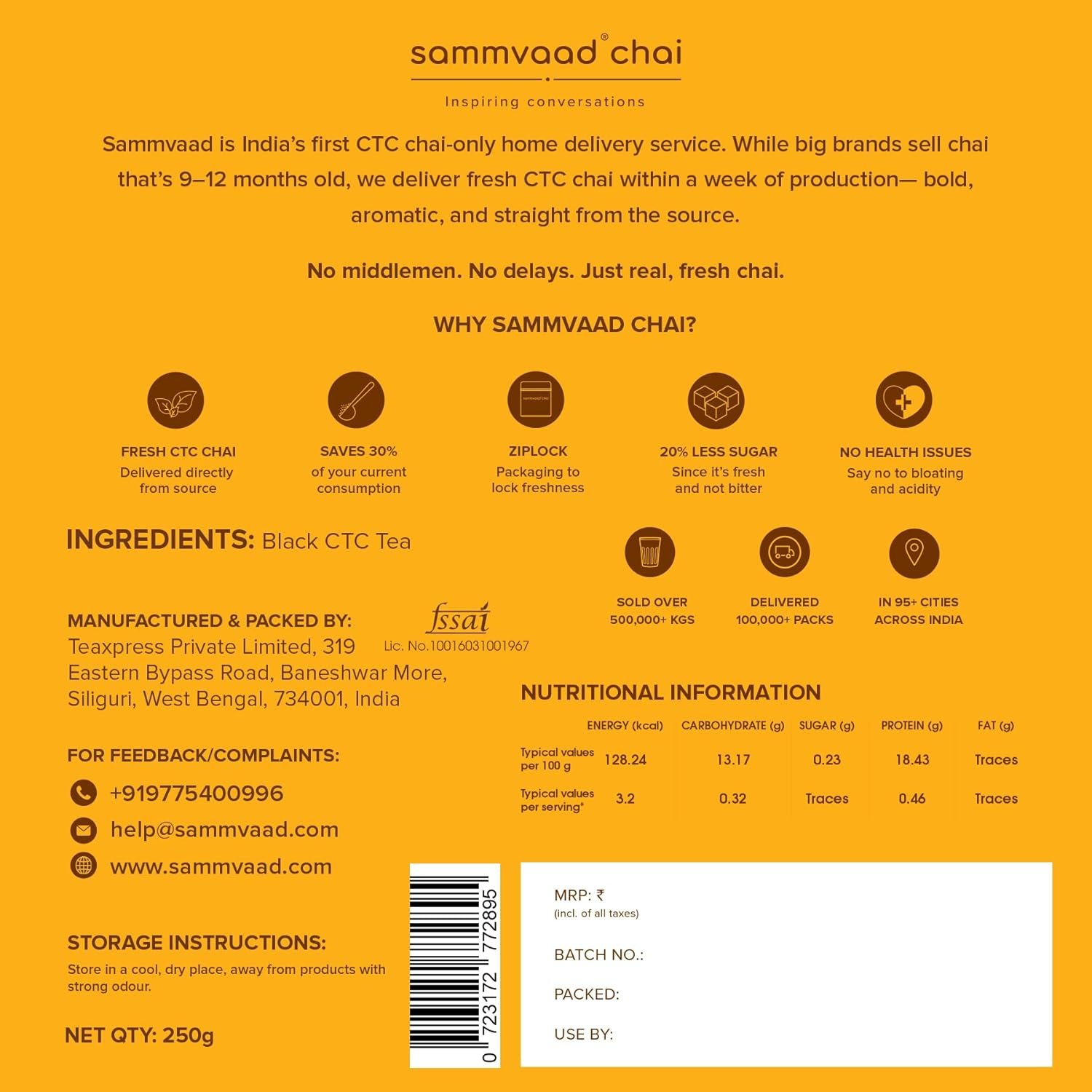 Be the first to review “Sammvaad Premium Kadak CTC Chai – 250g | Strong & Aromatic Assam Tea | Fresh CTC Tea for Rich Flavor | Makes 135 Cups | Zip-Lock Pack”