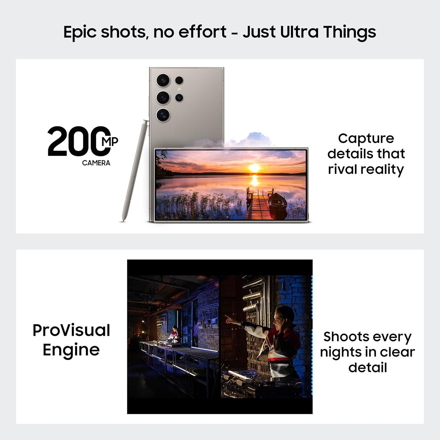 - Epic Camera – With the most megapixels on a Galaxy smartphone ever (200MP) and AI processing, Galaxy S24 Ultra sets the industry standard for image quality every time you hit the shutter. Also, the new ProVisual engine recognizes objects, improves color tone, reduces noise and brings out every detail.