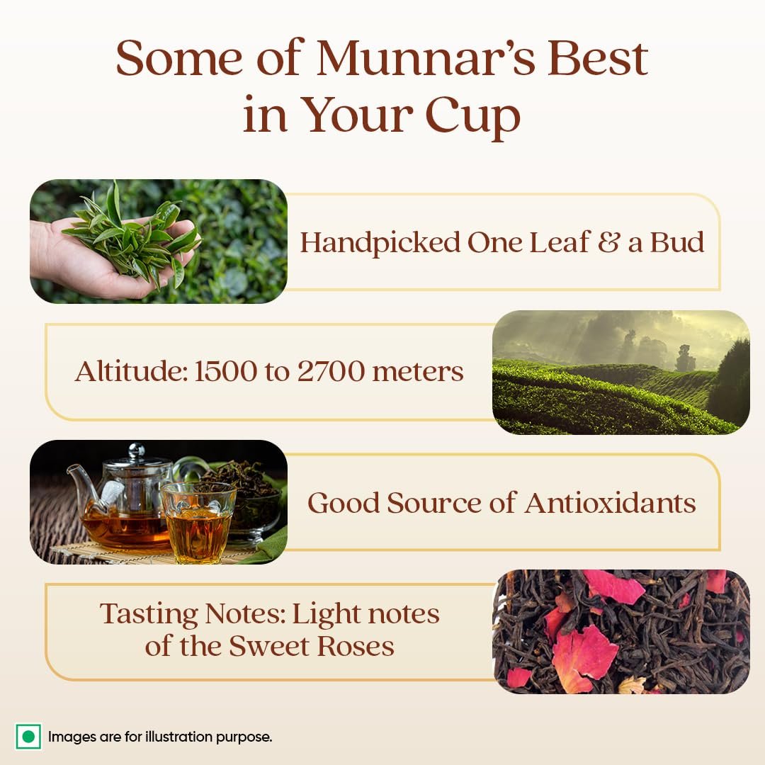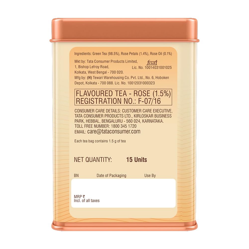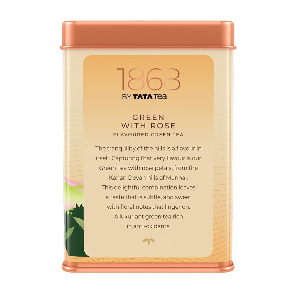 - GREEN WITH ROSE: 1868 by Tata Tea Green with Rose is a flavoured Green tea with Rose petals that captures the tranquillity of the Kanan Devan hills of Munnar