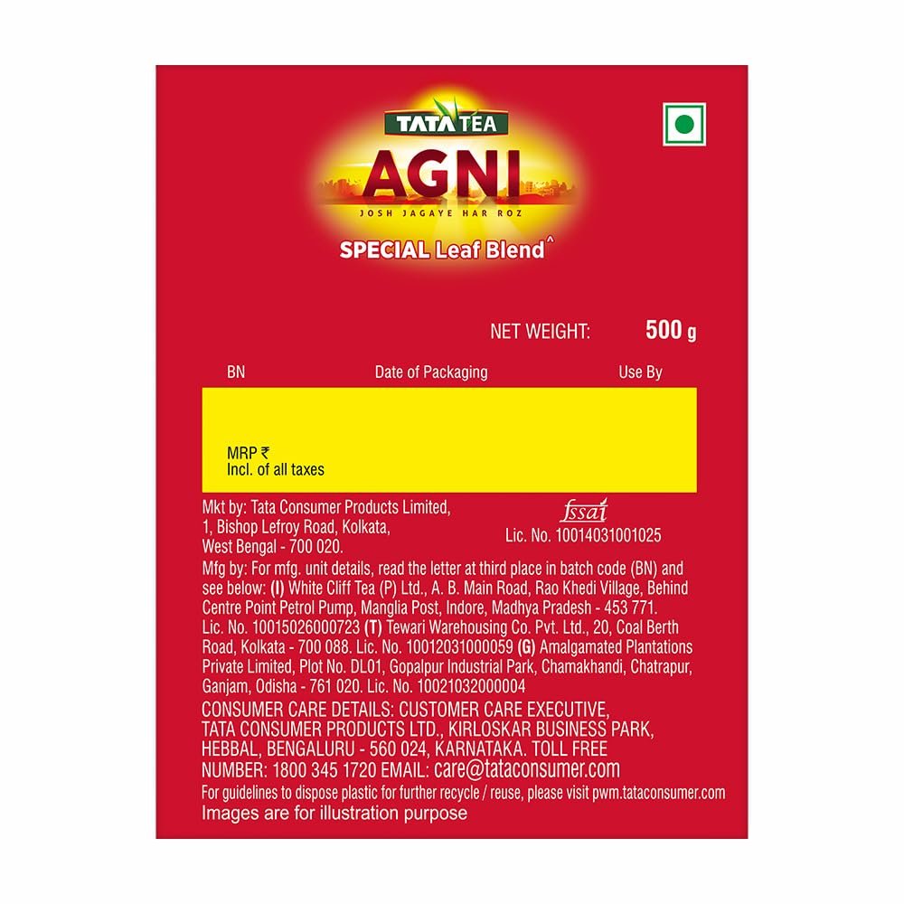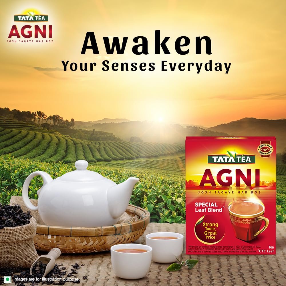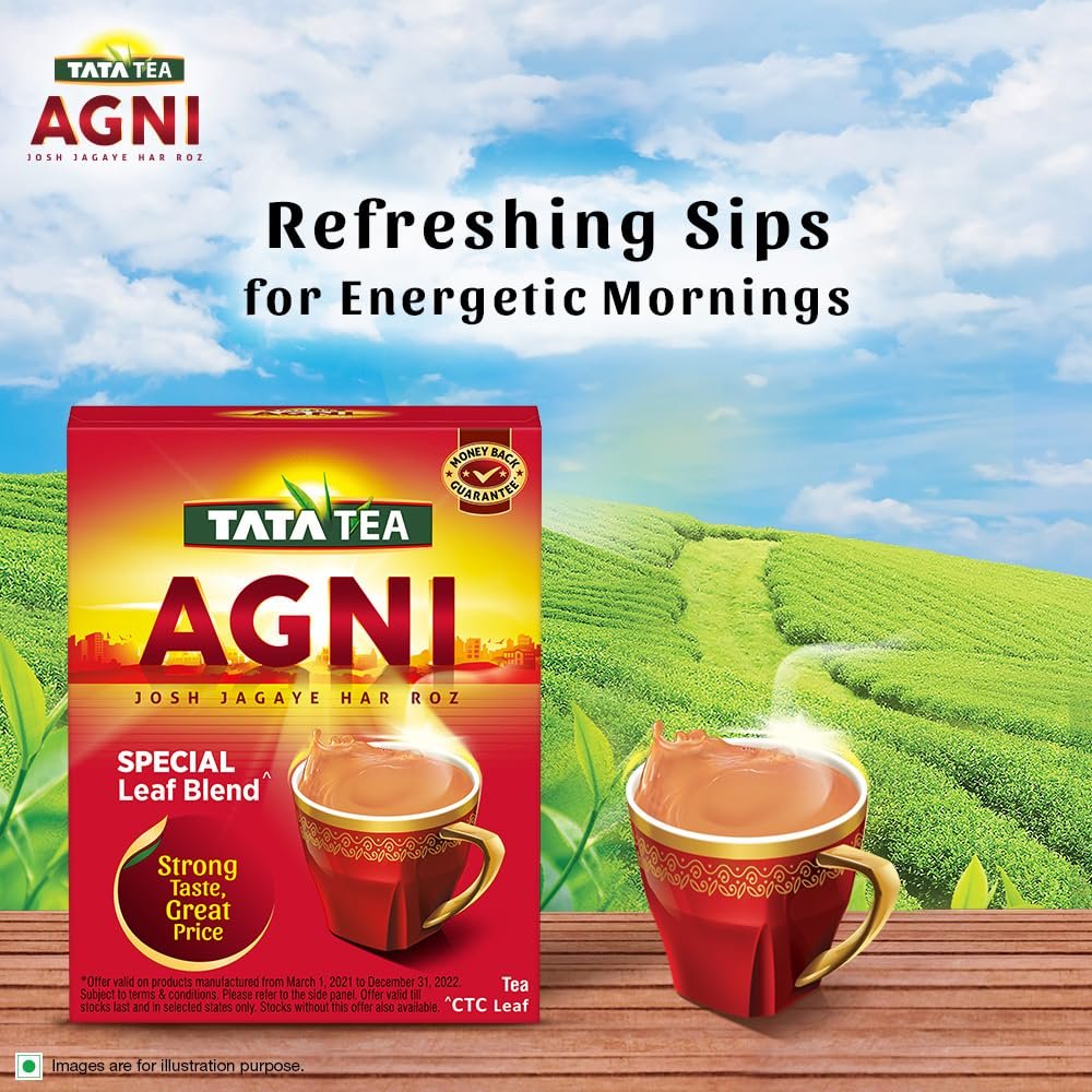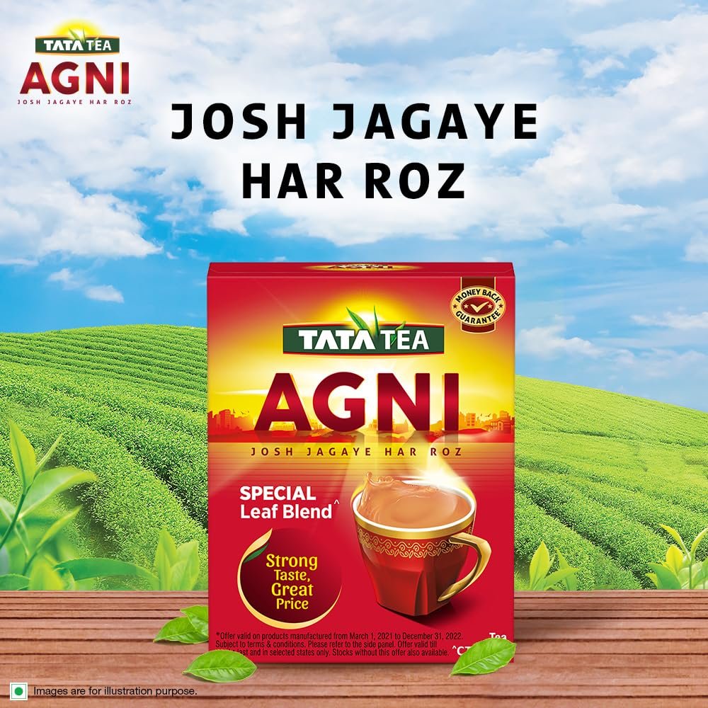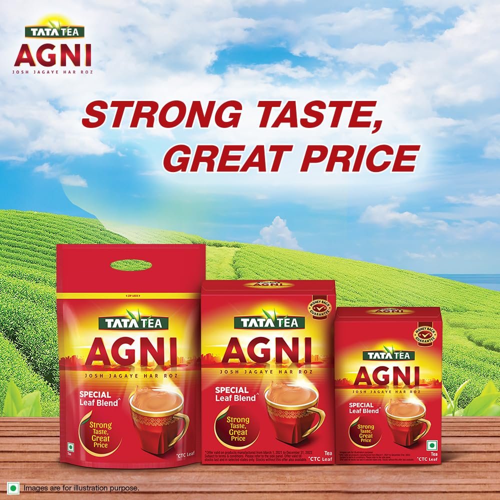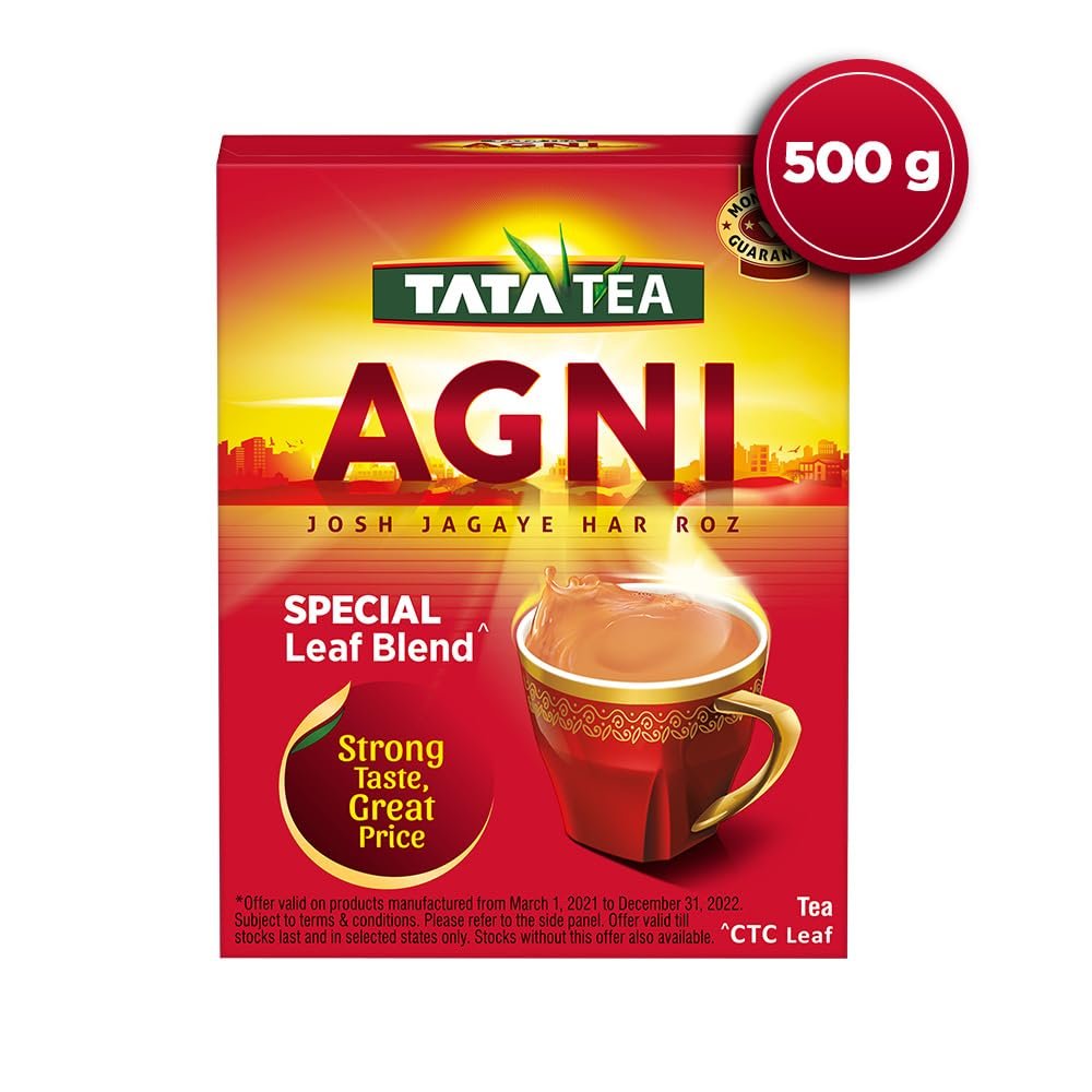 Energetic sip every morning! Tata Tea Agni Special Leaf Blend is a special blend of CTC leaves that offers an invigorating experience every morning. Energize yourself and face your day with Tata Tea Agni. If you are longing for a strong cup, then Tata Tea Agni is what you need with its promise of Strong Taste, Great Price. Enjoy perfect richness in every sip of tea. Have this strong cup of tea to awaken your senses in the morning, between work or with your evening snack. Usage: Add Tata Tea Agni in boiling water. Add sugar and milk. Continue to boil for a few minutes. Strain into a cup & enjoy your strong cup of tea. Storage: Once opened, transfer the contents into an airtight container and keep the lid tightly closed after each use.