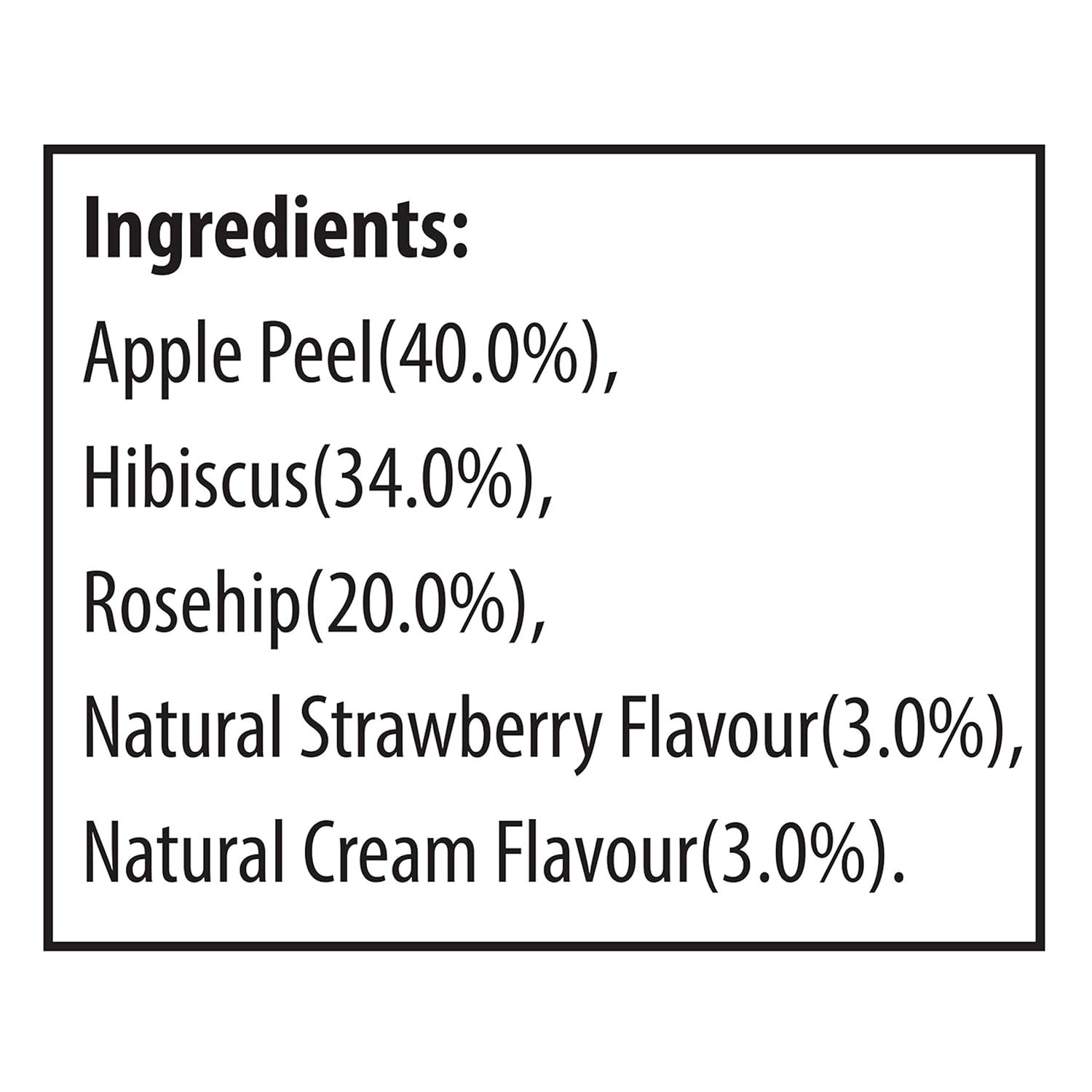 | Ingredients | Apple Peel(40%), Hibiscus(34%), Rosehip(20%), Natural Strawberry Flavor(3%), Natural Cream Flavor(3%) |