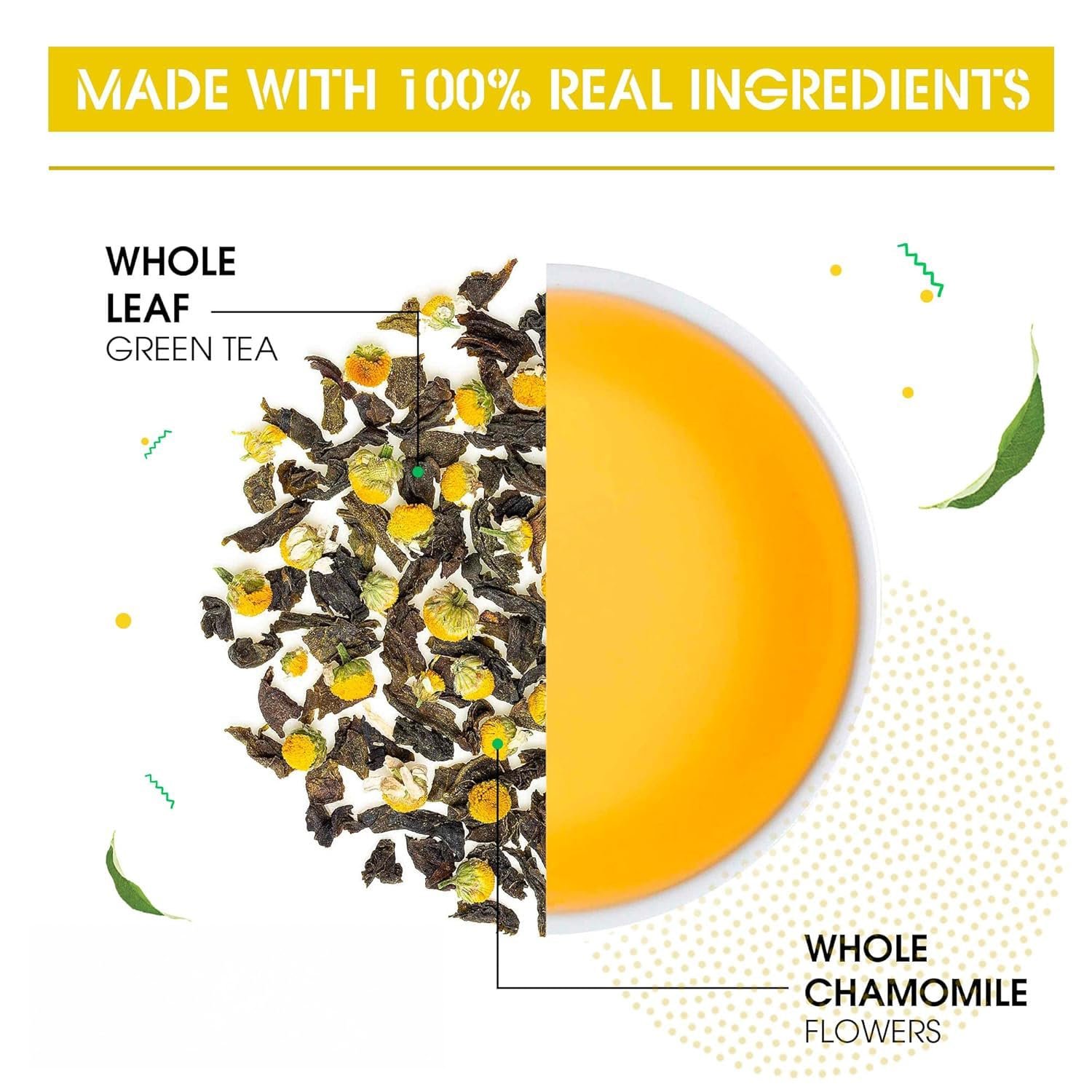 - Chamomile Green Tea – Enjoy the soothing blend of real chamomile flowers and premium whole leaf green tea. Each pyramid tea bag is individually wrapped for freshness and convenience.