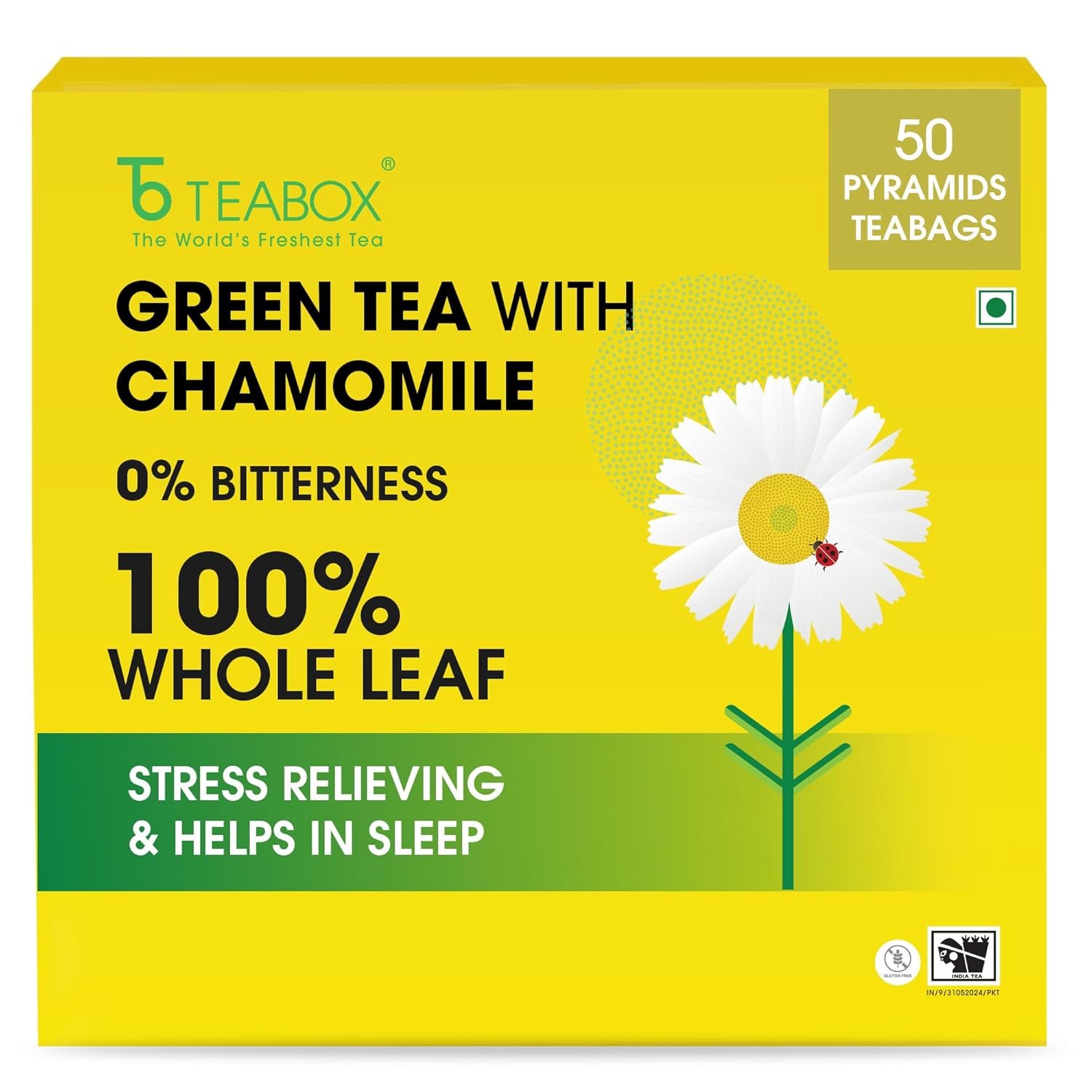 Teabox Chamomile Green Tea: Premium blend of green tea and Egyptian chamomile. Finest Indian tea gardens. Delicate and fragrant taste for freshness. Enjoy hot or iced, with or without honey.