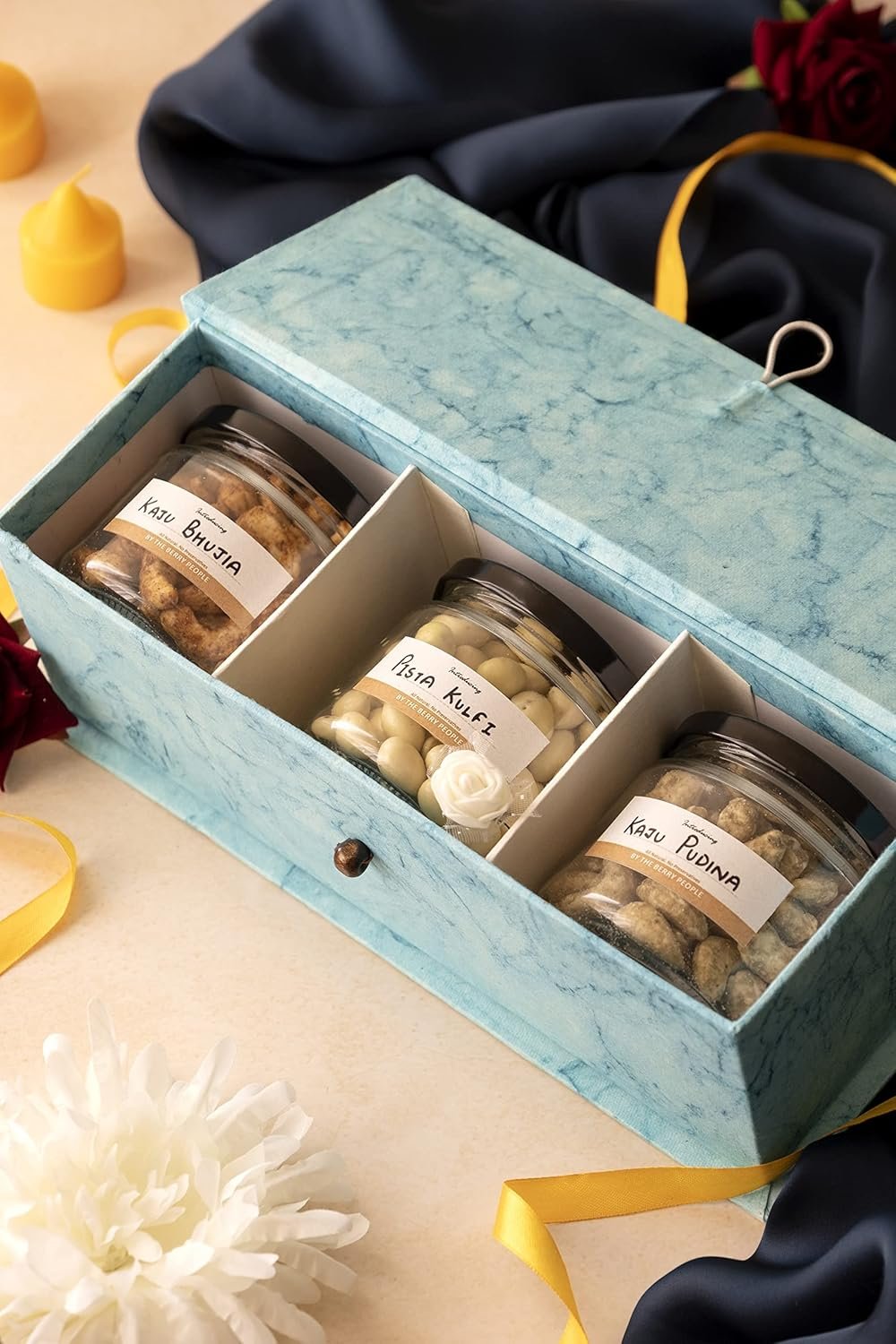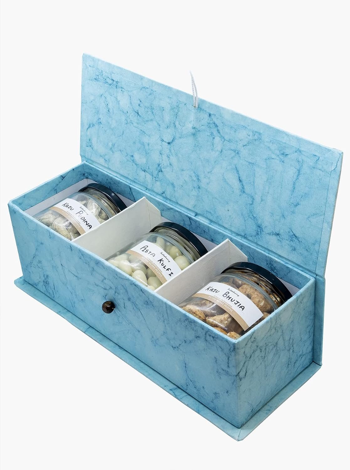 - WHAT DO YOU GET : Kaju Pudina-80g, Kaju Bhujia-80g & Pista Kulfi-200g in a beautiful curated box.( 4 Boxes)