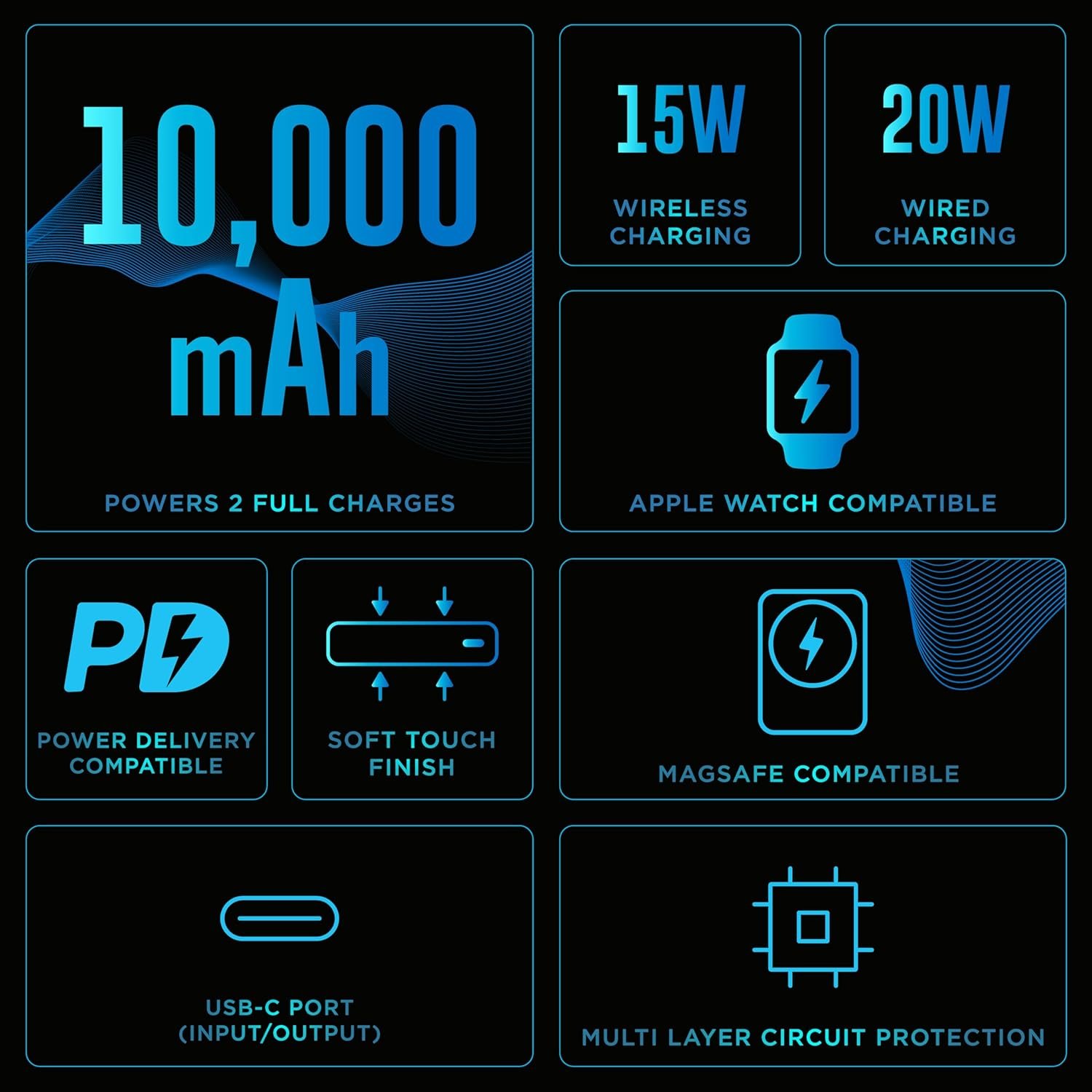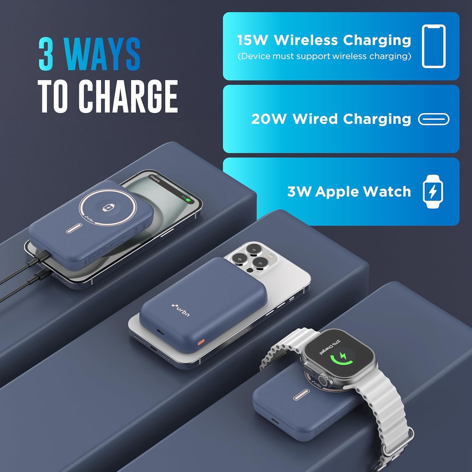 - š One Power Bank, Four Devices ā Ditch the cable chaos. Wirelessly charge your iPhone, Apple Watch, AirPods, and Android/Qi-enabled devicesāall at onceāwherever life takes you.