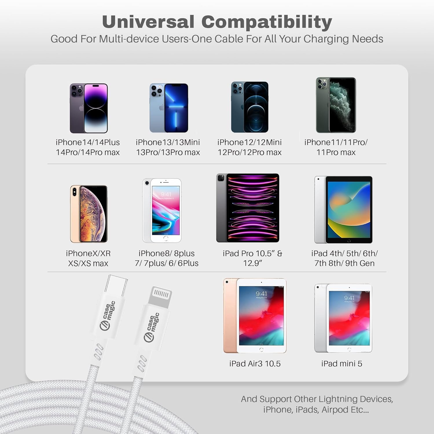 - Wide Compatibility With Apple Devices: Supports all iPhone models from 14 to 6 series, including SE, Plus, Mini, Pro, and Max variants. Also works seamlessly with iPad, iPod, and devices using a Lightning connector.