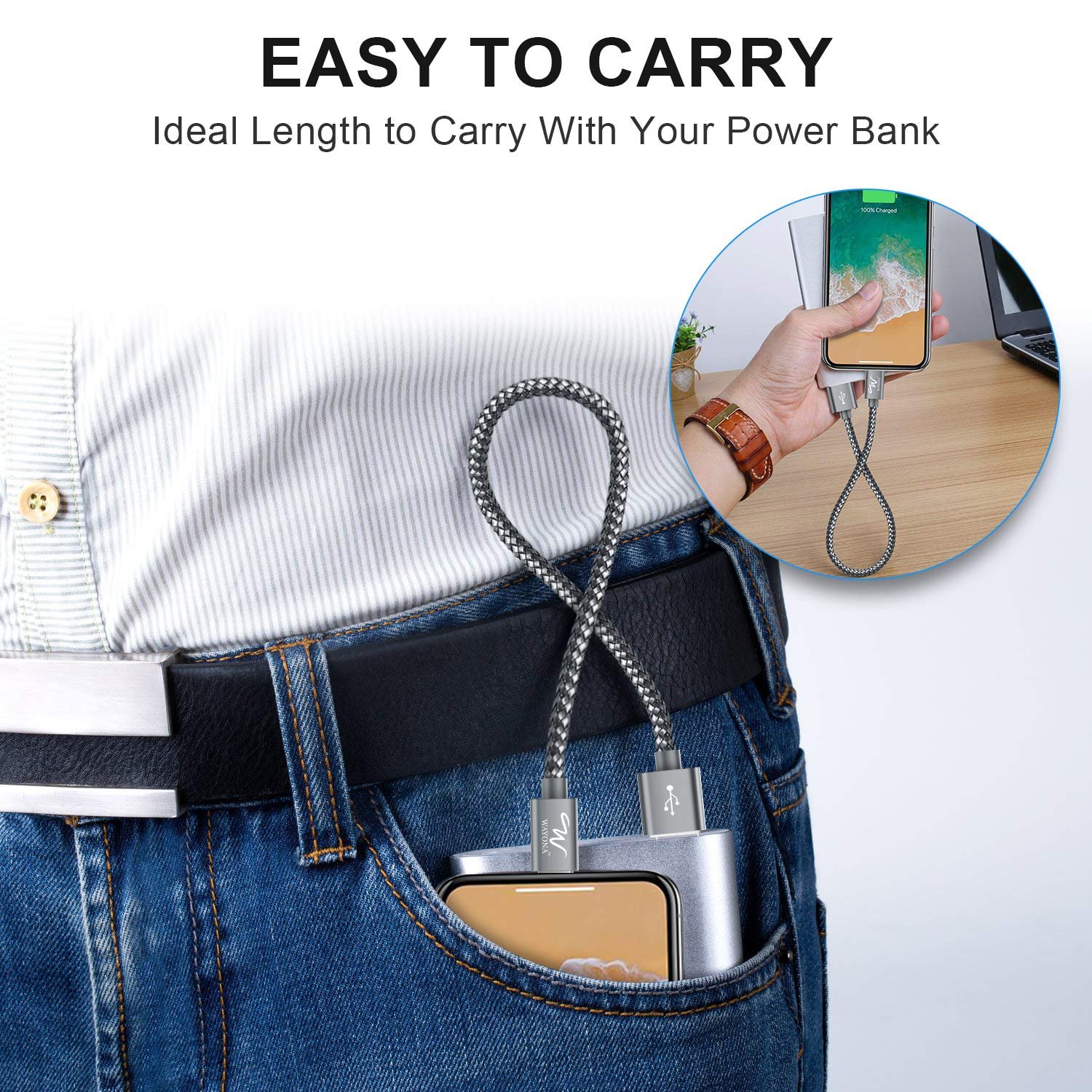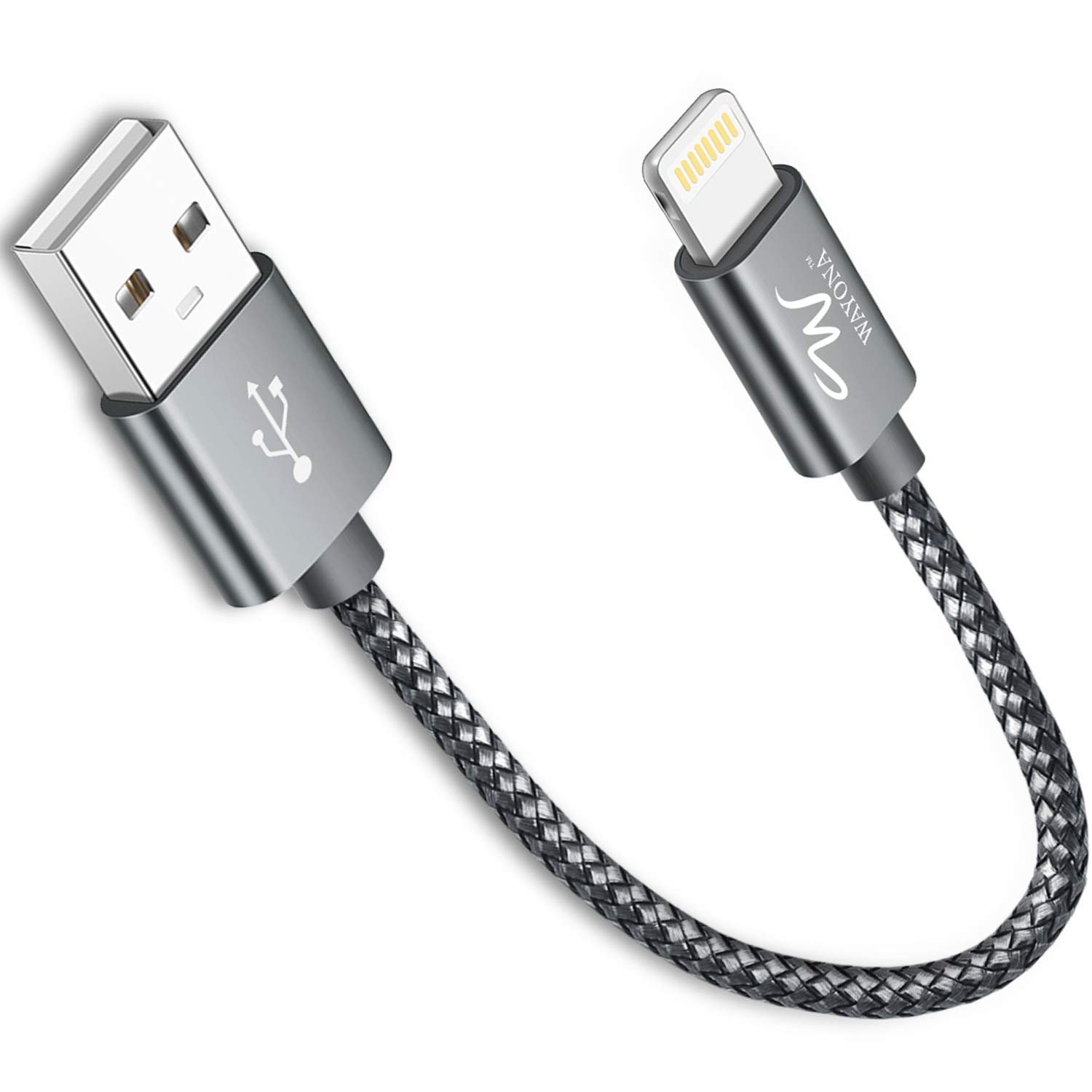 Wayona Nylon Braided Lightning Short Power Bank Charging Cable with Data sync and Carplay support for iPhones, iPad Air, iPad Mini, iPod Nano and iPod Touch (0.25M Short Cable, Grey)