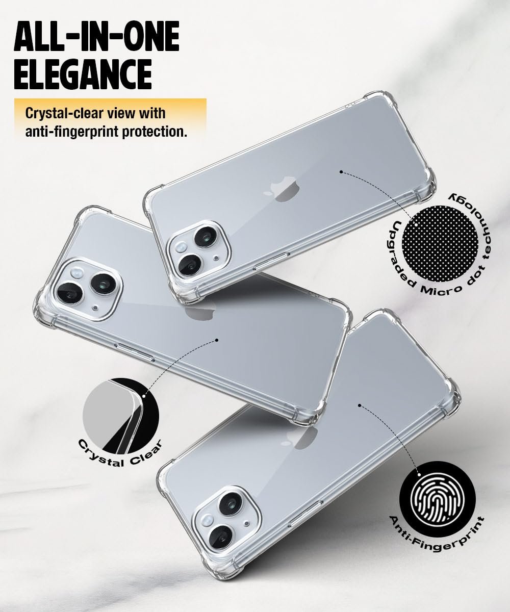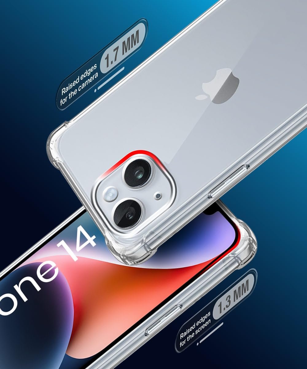 | Special Features | CAMERA and SCREEN PROTECTION – Raised bezels lift camera and screen off flat surfaces, protecting from scratches and scuff marks. Ultra slim, Flexible, light weight Anti Smudge, Designed Exclusively For Apple iPhone 14 – Superior Quality TPU Material and a durable Clear Transparent back panel, FULL COMPATIBILITY – This Back Case is designed and tested to be compatible with most screen protectors. Compatible with Apple iPhone 13 case cover, PRECISE BUTTONS AND CUTOUTS – Pronounced buttons are easy to feel and press, while large cutouts for the charging port fits most cables. Supports bilateral wireless charging., SHOCK PROOF PROTECTION – Highly Protective Rugged Armor for Complete Protection of Mobile Frame and Screen from scratches, falls, and shocks. |